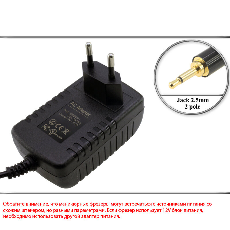 Адаптер (блок) питания 9V, 0.6A, Jack 2.5mm 2 контакта, для аппарата маникюра и педикюра, фрезера Fraer; Luazon LMH-01; Nail Professional и др. интересное: