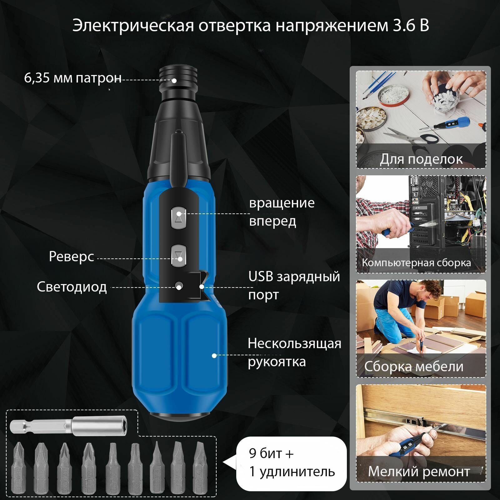 | Комплектация | Отвертка - 1 шт. Набор бит - 9 шт. Удлинительная бита - 1 шт. Кабель зарядки - 1шт. руководство пользователя - 1шт. |