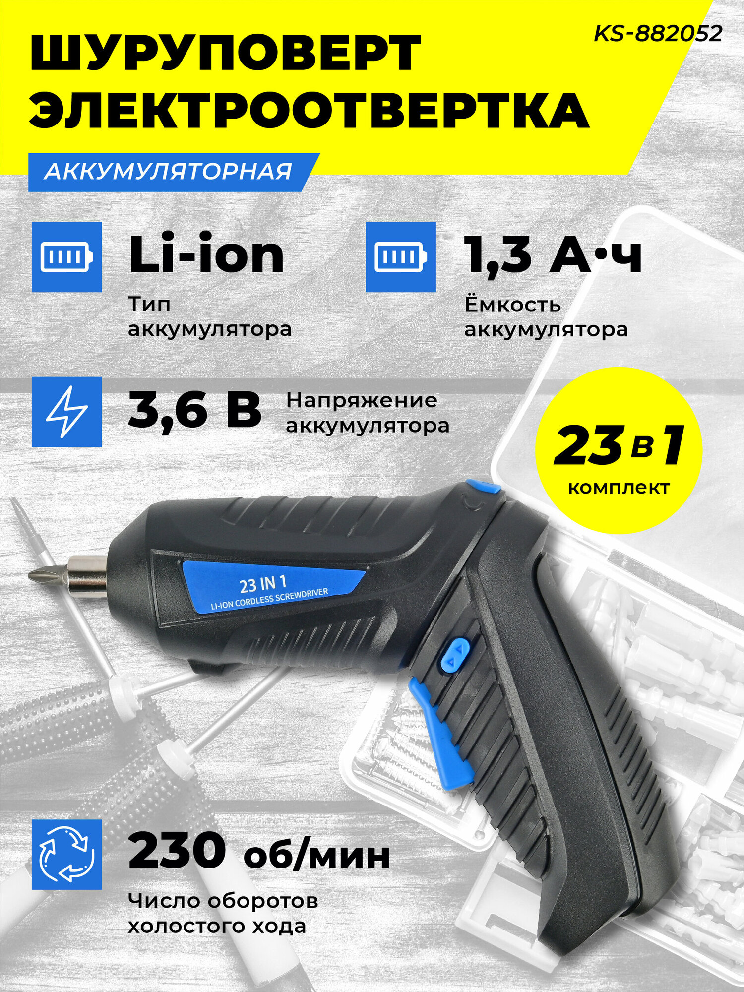 Ниже Вы можете прочитать отзывы на Электроотвертка аккумуляторная с набором насадок 23 в 1/Шуруповерт с битами KS-882052/Электро инструмент для ремонта, монтажа, ознакомится с подробными характеристиками, посмотреть интересные обзоры и фотографии на Электроотвертка аккумуляторная с набором насадок 23 в 1/Шуруповерт с битами KS-882052/Электро инструмент для ремонта, монтажа.