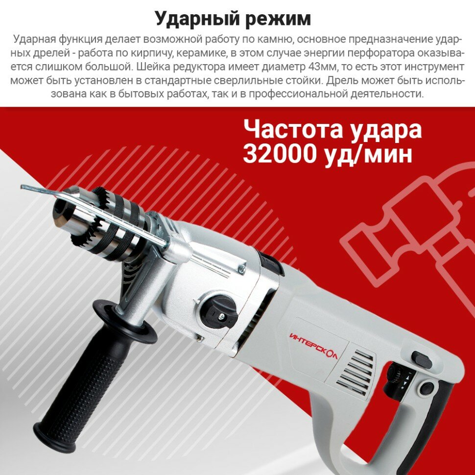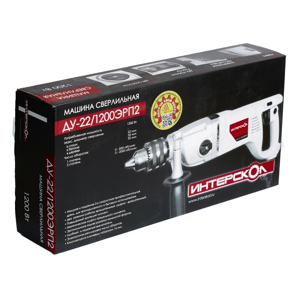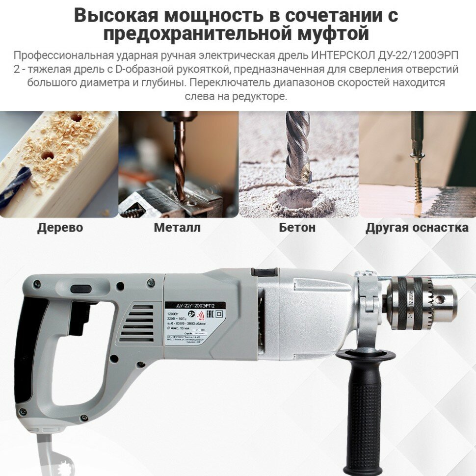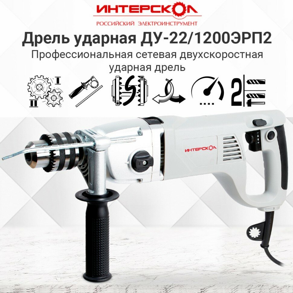 Ударная дрель ИНТЕРСКОЛ ДУ-22/1200ЭРП2 330.1.0.00, профессиональная двухскоростная мощная с предохранительной муфтой ,1200 Вт, 16 мм, 2000 об/мин интересное: