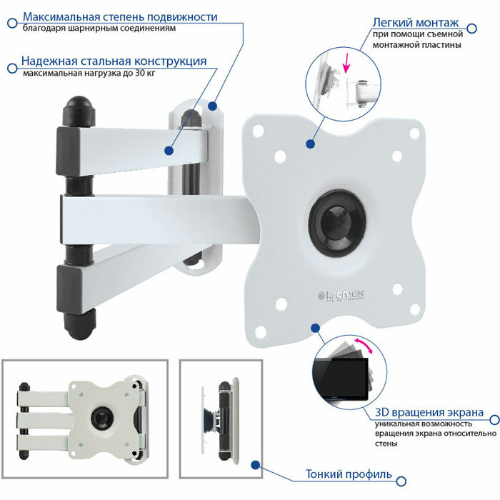 СохранитьКронштейн наклонно-поворотный Kromax DIX-15 10-28' до 30кг Vesa до 100x100 белый интересное: