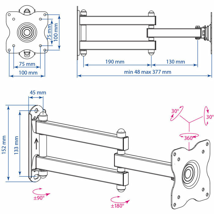 Кронштейн DIX-15, для ТВ, наклонно-поворотный, 15-28", 48-377 мм от стены, черный