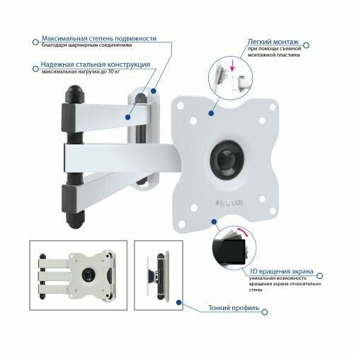 Кронштейн Kromax DIX-15 белый 15"-28" max 30кг VESA 100x100 поворот и наклон