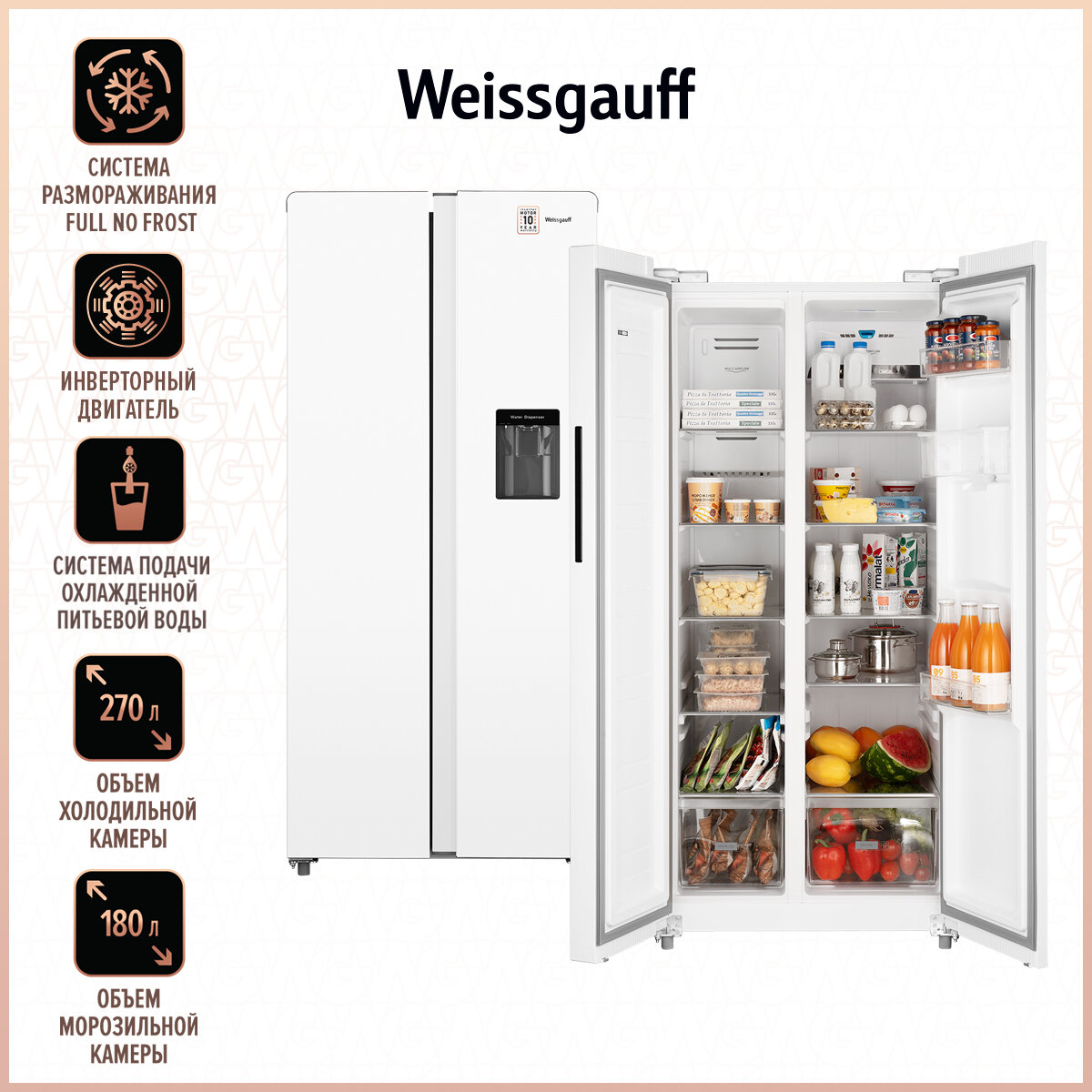 Отдельностоящий холодильник с инвертором и подачей воды Weissgauff WSBS 600 W NoFrost Inverter Water Dispenser Side by Side двухдверный, 3 года гарантии, Мощность замораживания 12 кг сутки, Объём 500 л, Сенсорное управление, Суперзаморозка, A+