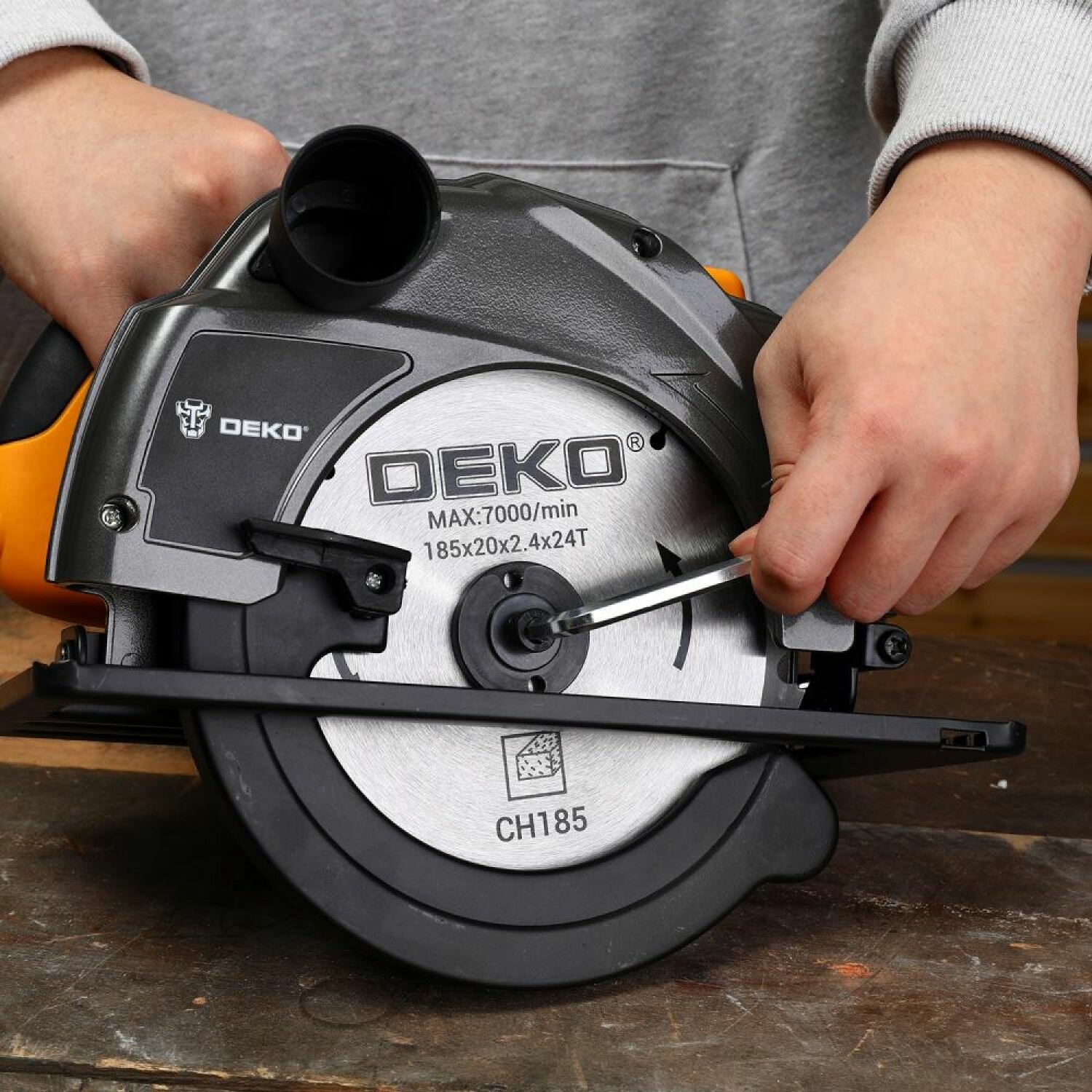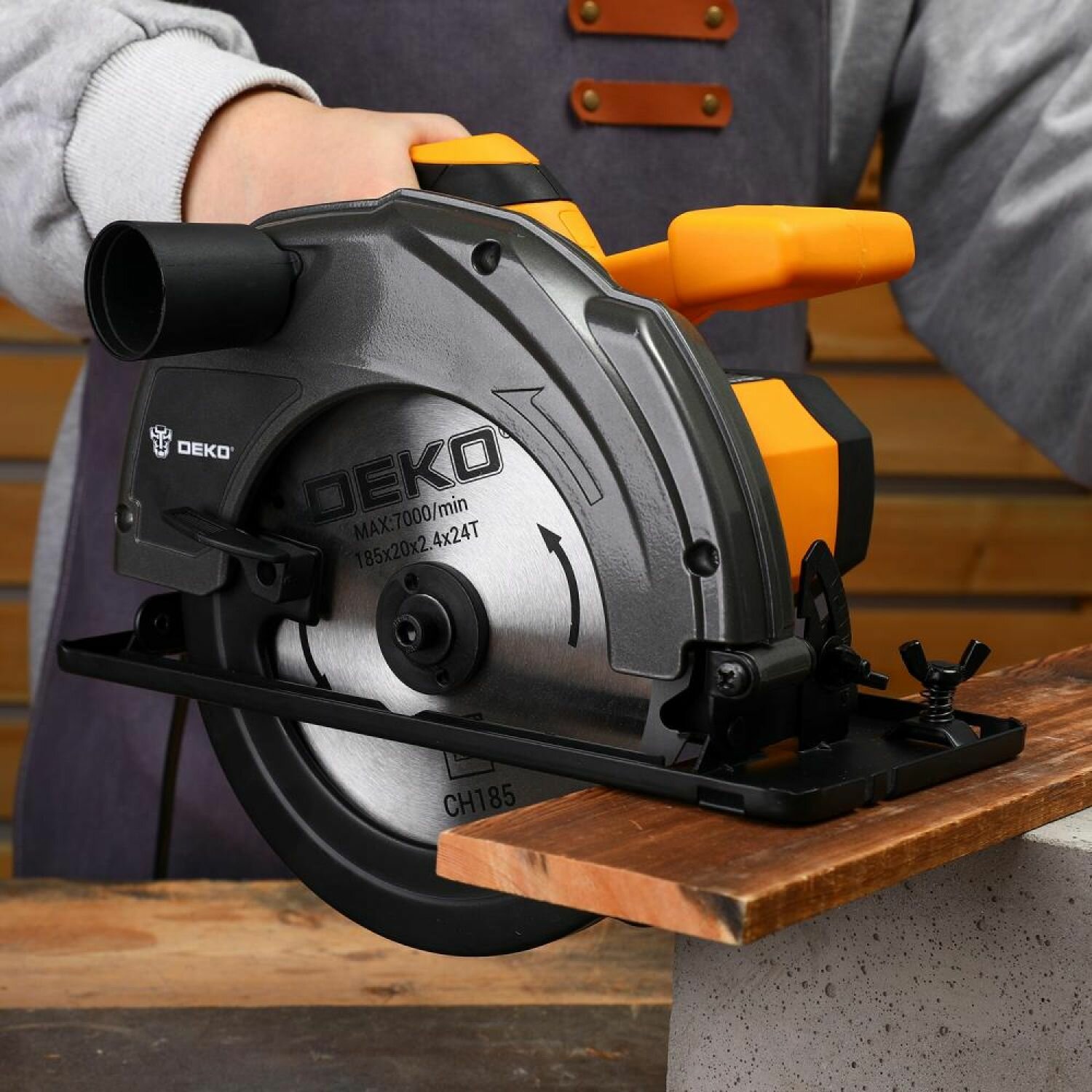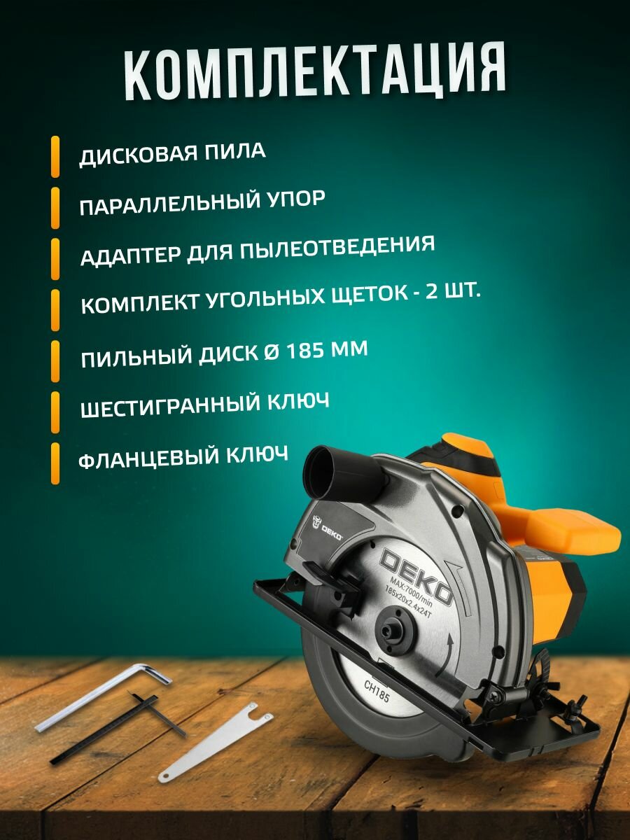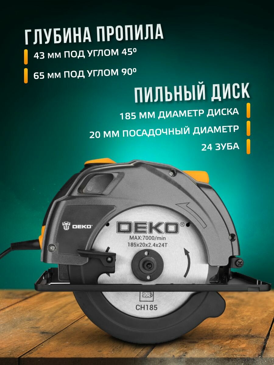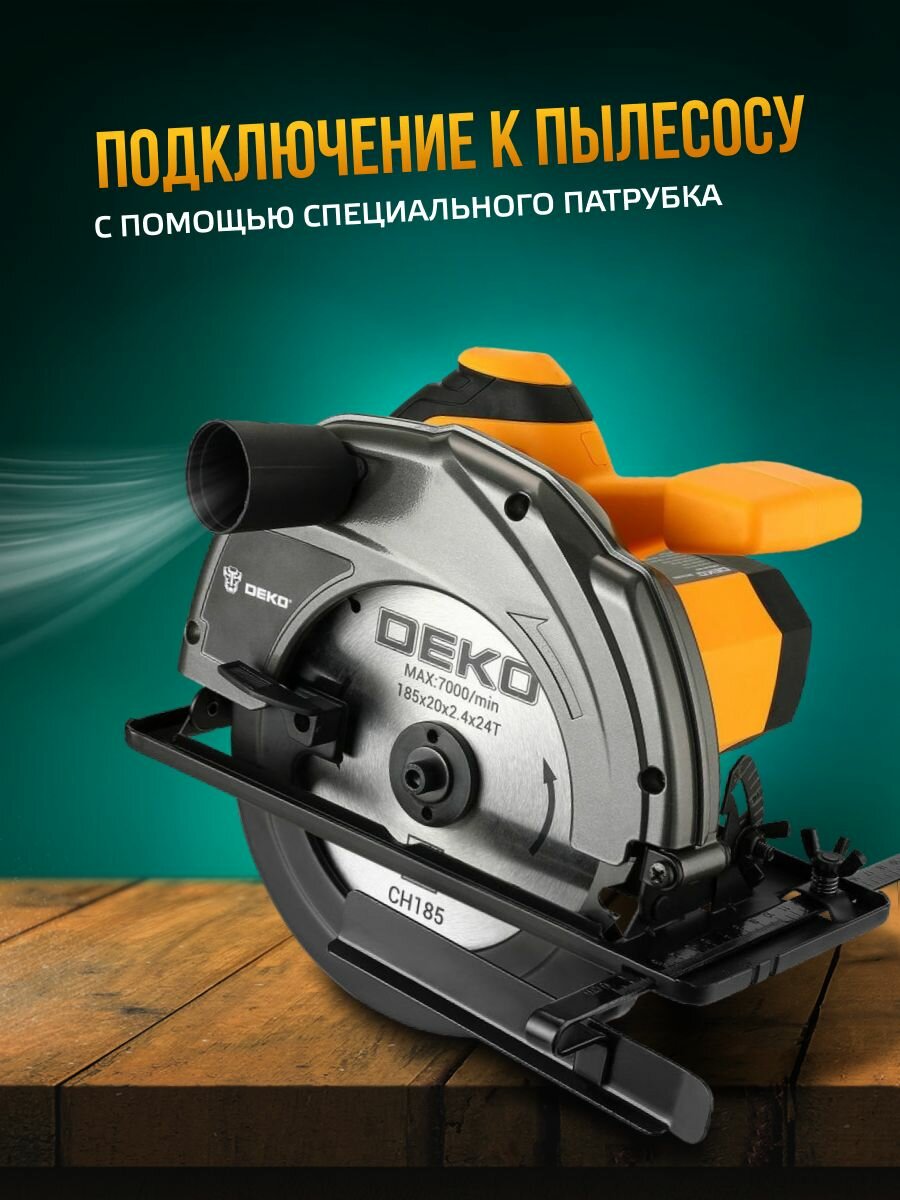 Циркулярная дисковая пила DEKO DKCS1800 циркулярка электрическая сетевая, 1800 Вт, 5000 об/мин, диск 185 мм, подключение к пылесосу, регулировка угла распила, возможность работы с направляющей шиной интересное:
