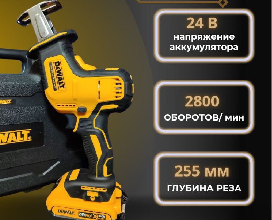 | Дополнительная информация | + Сабельная пила DeWalt, + 2 аккумулятора, + зарядное устройство, + прочный кейс для хранения, + перчатки |