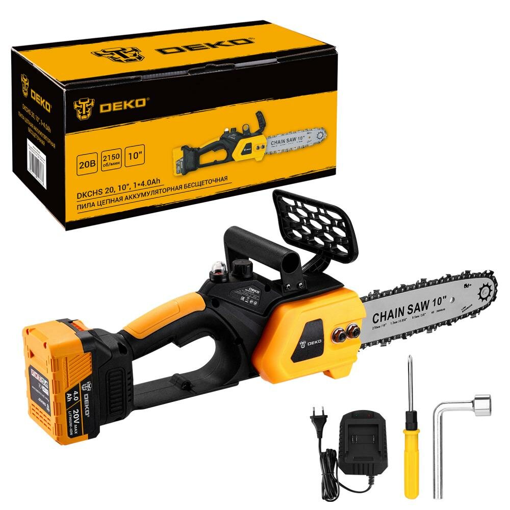 Пила цепная аккумуляторная бесщеточная Deko Dkchs 20, 10", 20В, 1x4.0Ач, з/у 083-2000