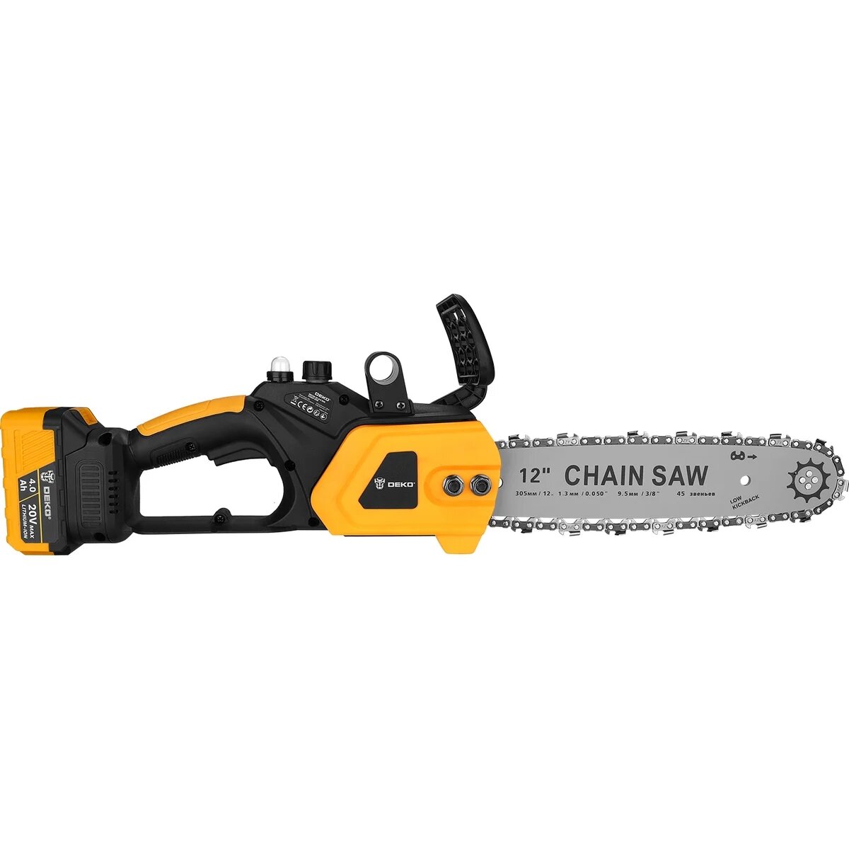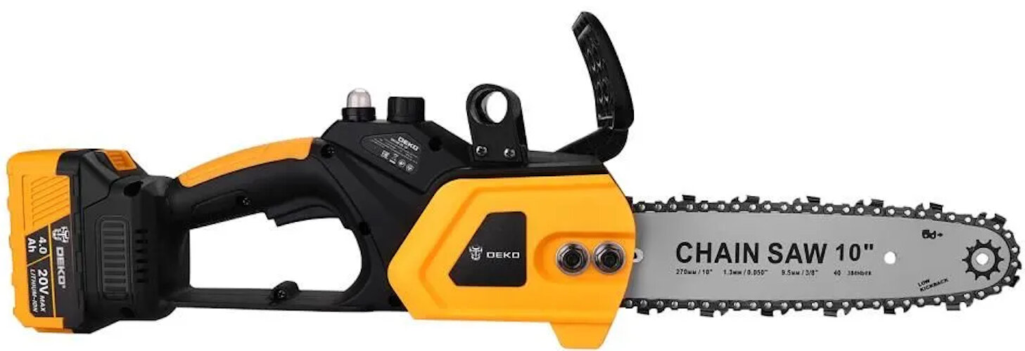 Пила цепная аккумуляторная Deko DKCHS 20, 10', 20В, 1x4.0Ач, з/у, черно-желтый