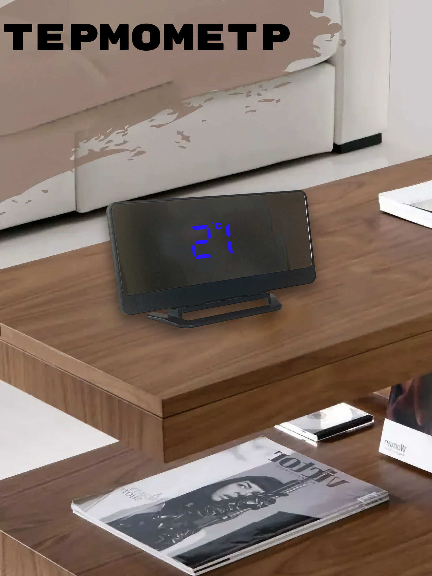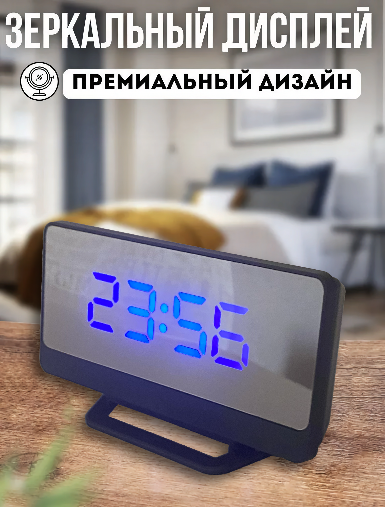 Часы настольные зеркальные электронные с будильником, датчиком температуры, светодиодная синяя подсветка интересное: