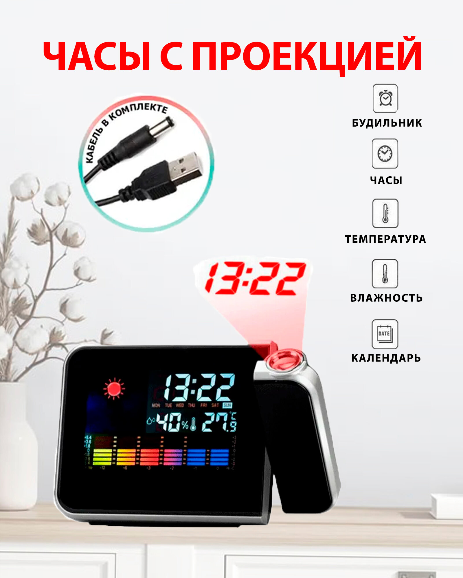 Купить Часы с проекцией, будильник, подсветка, температура и влажности/DS-8190