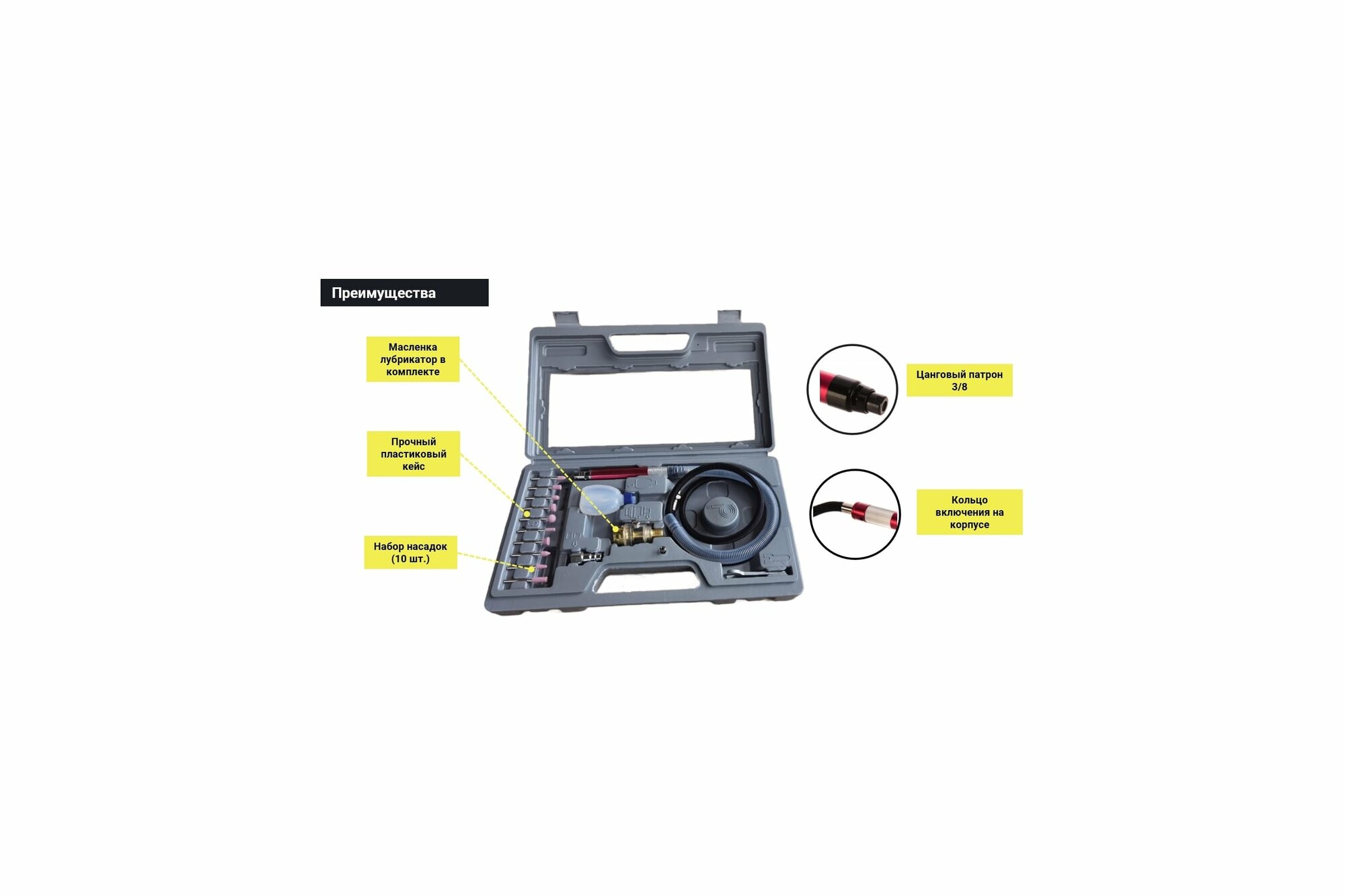 | Комплектация | Гравер с цангой 1//8” и шлангом - 1 шт Соединительный штуцер - 1 шт Ключ - 2 шт Масленка - 1 шт Емкость с маслом - 1 шт Рабочая насадка - 10 шт Руководство по эксплуатации - 1 шт Пластиковый кейс - 1 шт |