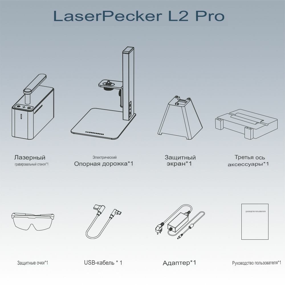 | Комплектация | LaserPecker 2 Super включает в комплектацию:- Гравер- Стандартный кронштейн- Роликовая платформа- Защитный экран- Кейс для гравера- Кейс для роликовой платформы- USB-кабель- Адаптер- Очки- Фирменный аккумулятор на 6400 mAh- Руководство пользователя |