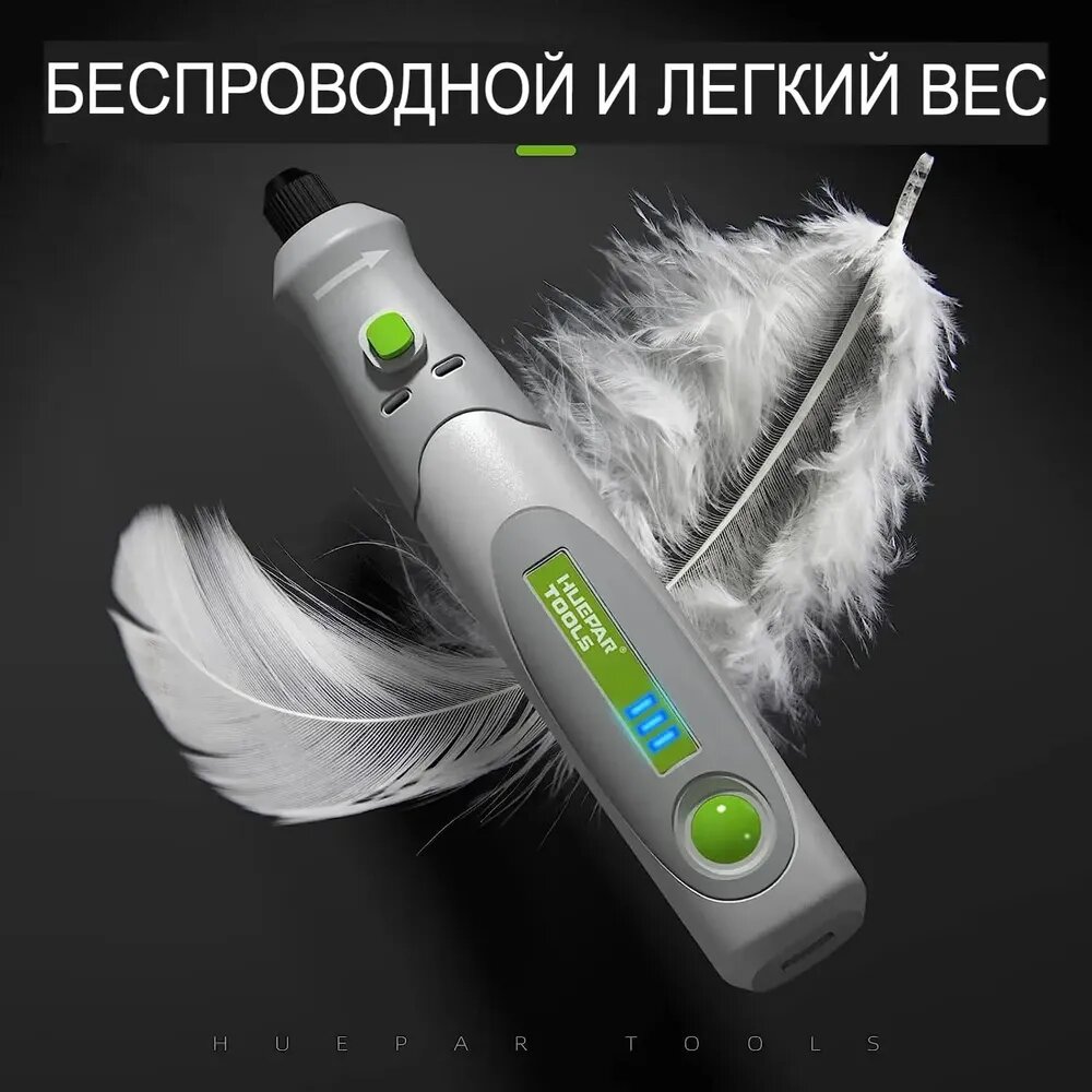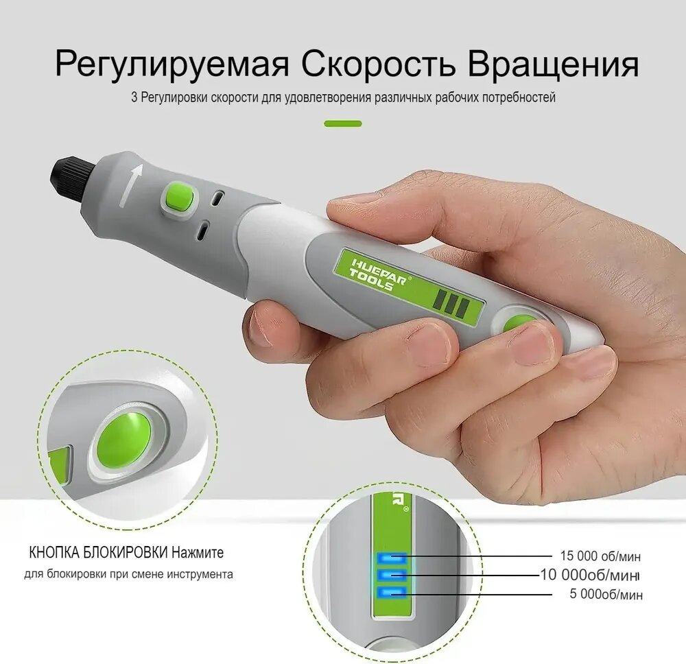 Гравер аккумуляторный для полировки, шлифовки, гравировки Huepar Tools, 4V, 3 скорости + набор из 58 насадок интересное: