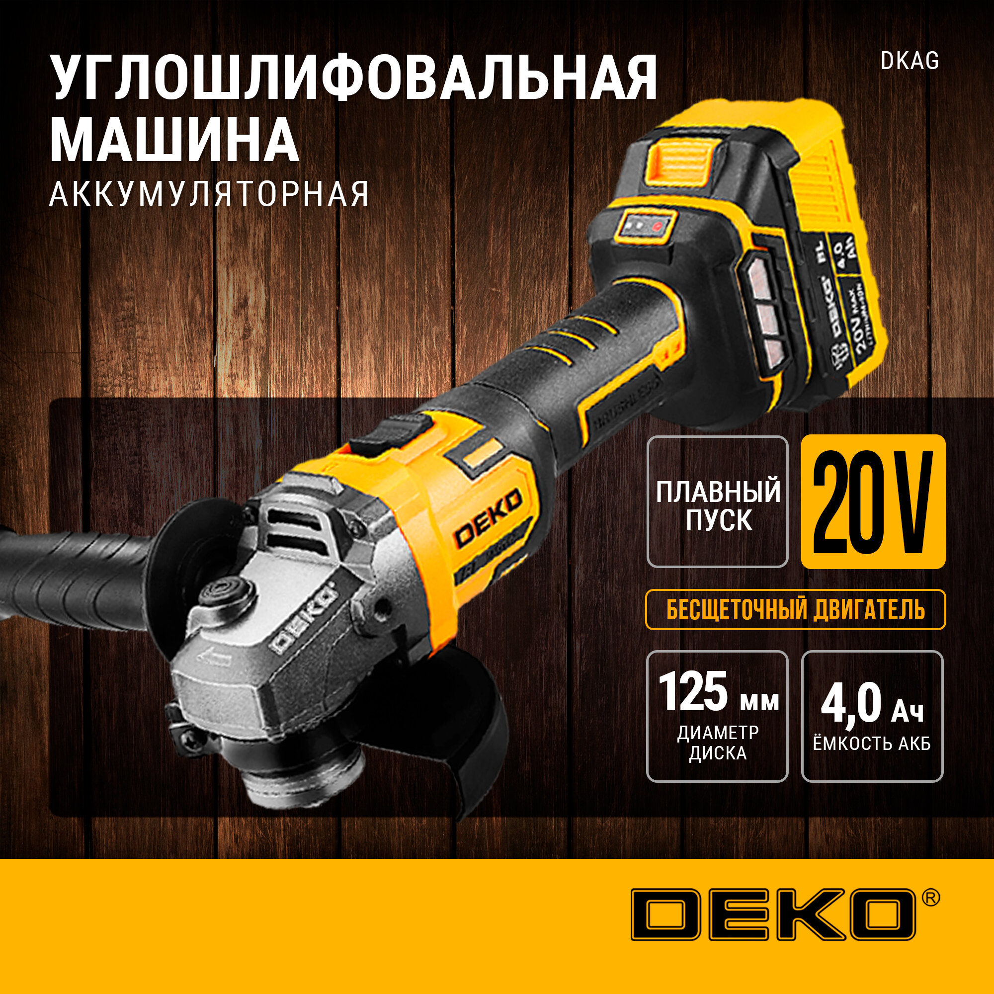 Купить Углошлифовальная машина бесщеточная DEKO DKAG, 20В, 1*4.0Ач