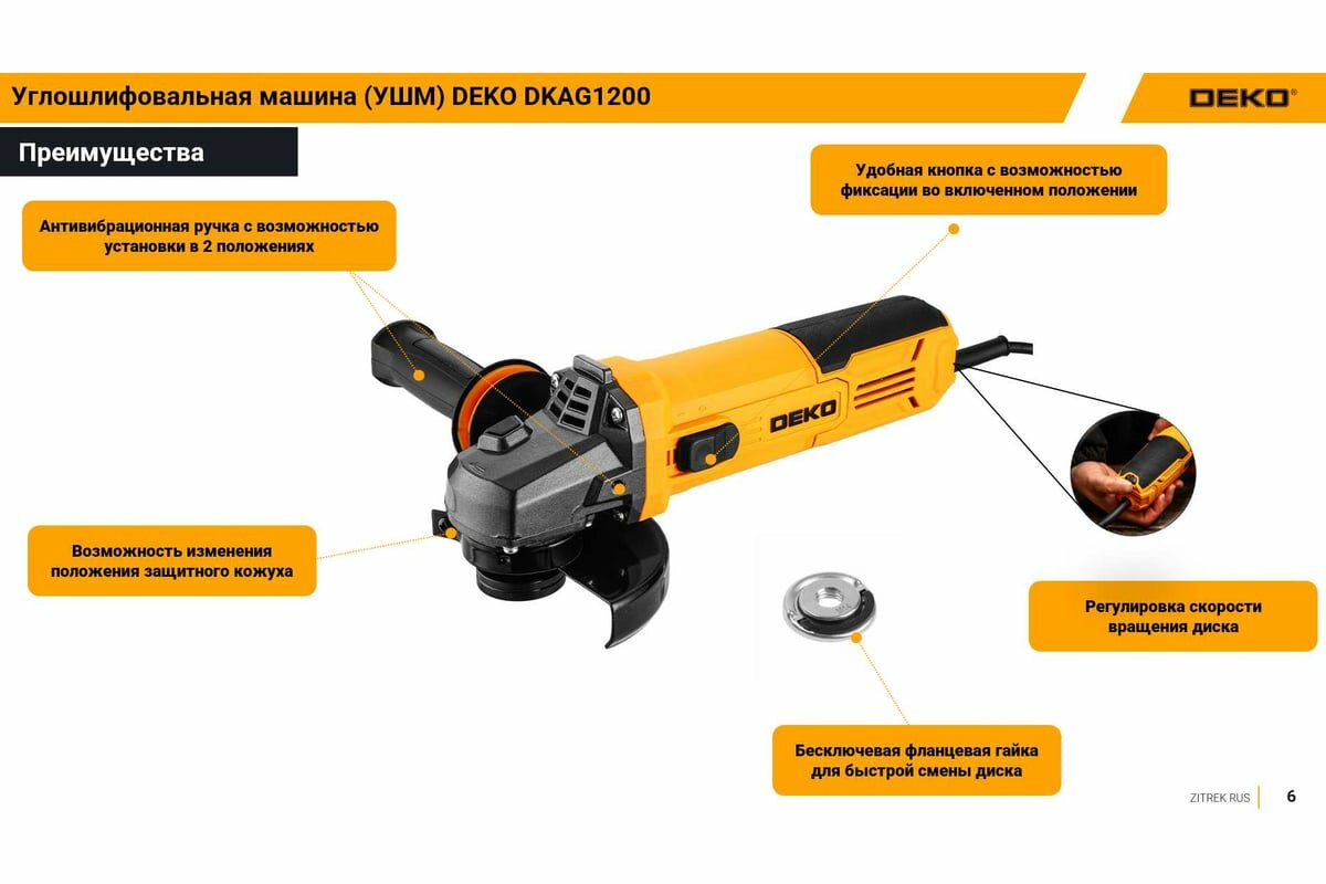 Углошлифовальная машина Deko DKAG1200 1200Вт 12000об/мин рез.шпин.:M14 d=125мм (085-1008) интересное: