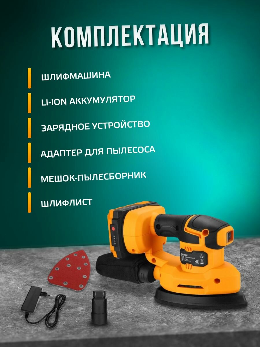 | Комплектация | Комплектация: 1шт шлифмашина 1шт АКБ 1шт зарядное устройство 1шт шлифлист 1шт адаптер для пылесоса 1шт мешок-пылесборник 1шт руководство по эксплуатации |