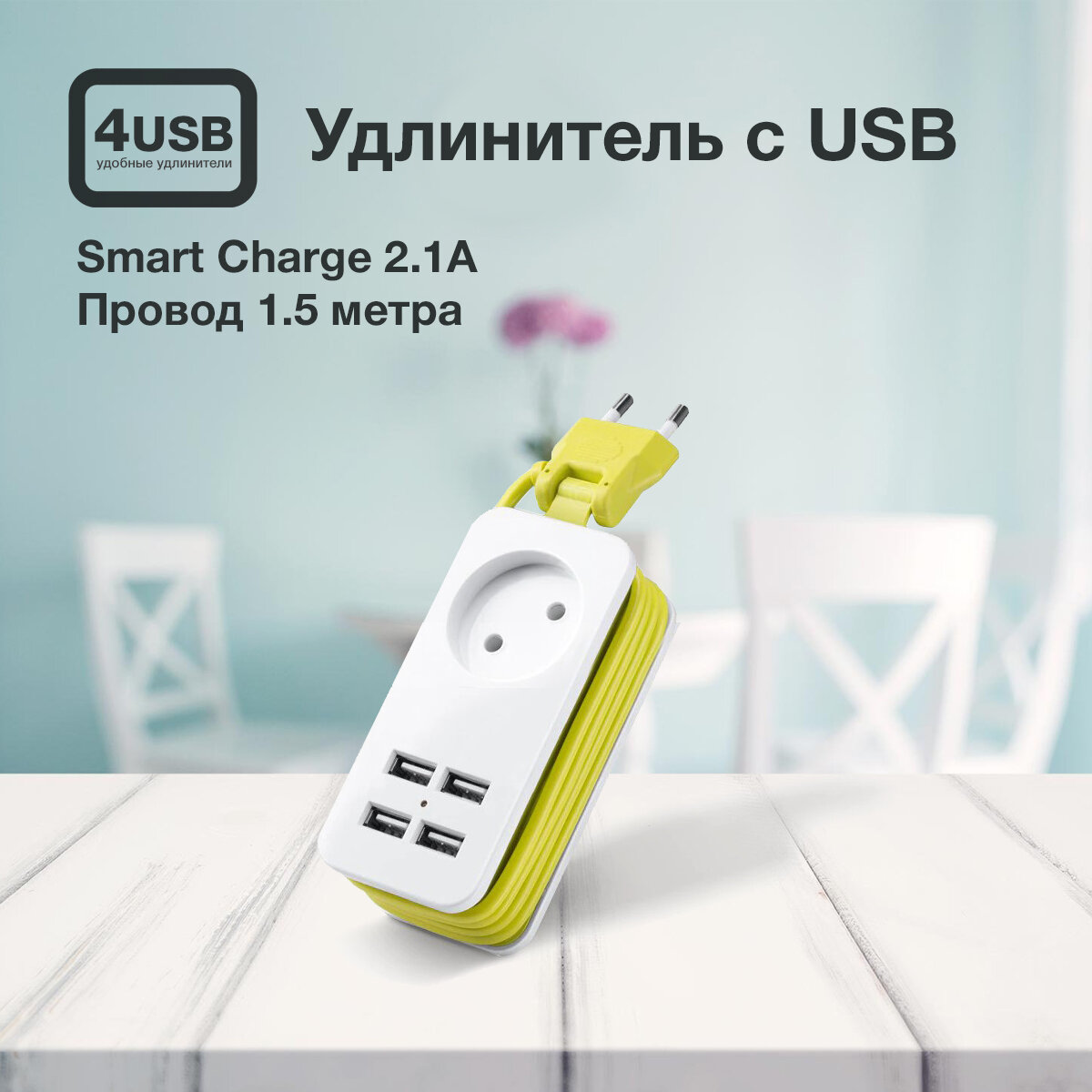 Удлинитель с USB на 1 розетку и 4 USB порта 1,5м белый интересное: