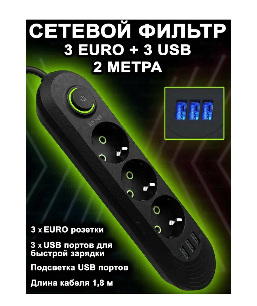 Сетевой фильтр, бытовой удлинитель с подсветкой USB-портов, длина 1.8 метра U-03USB/ Сетевой фильтр 1.8м. 3 розетки, 3 USB, черный интересное: