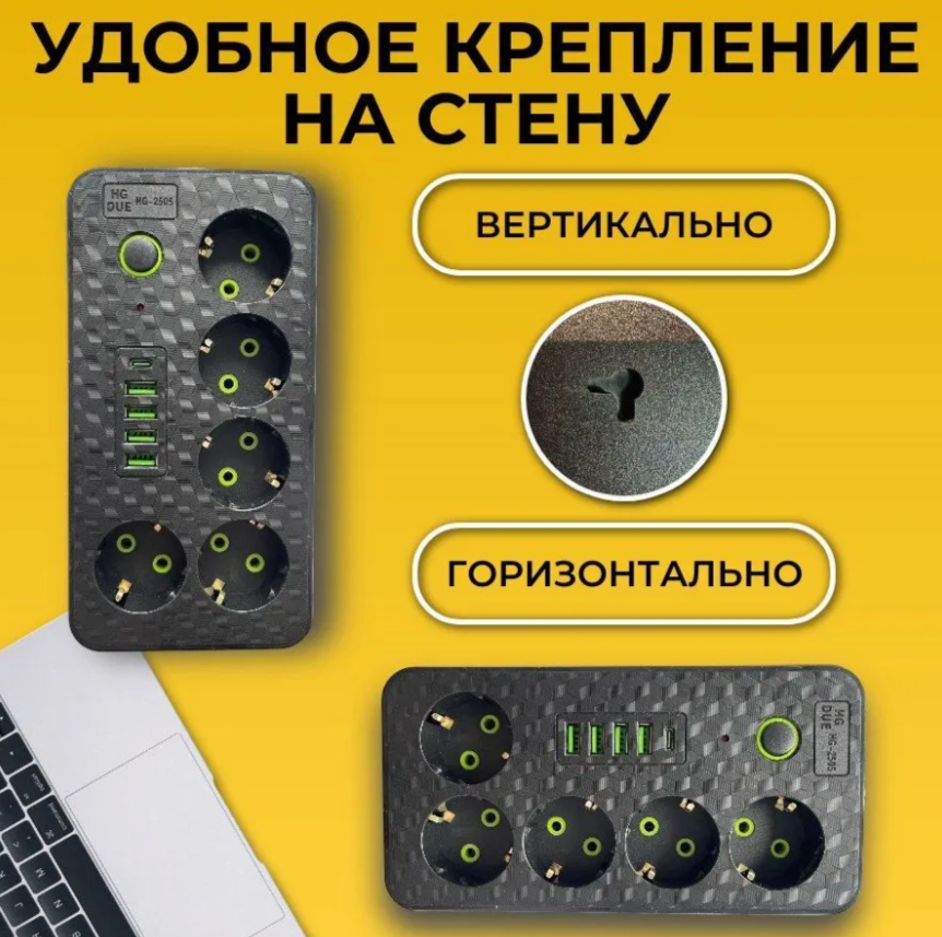 Сетевой фильтр с 6 розетками 2USB + 1 Type-C / Многофункциональный удлинитель с предохранителем