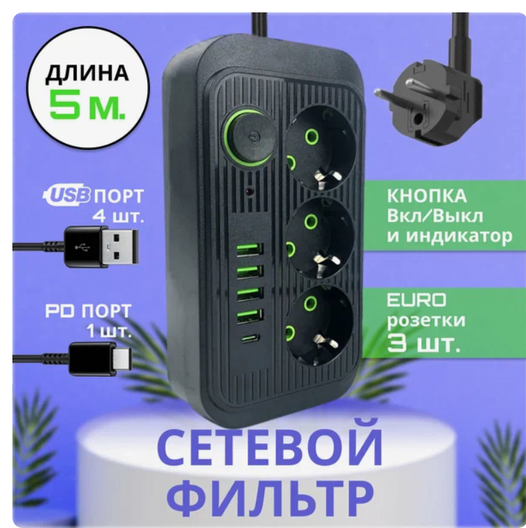 Удлинитель, Сетевой фильтр 3 розетки, 4 USB, 1 Type-C ,5 метра, выключатель, черный интересное: