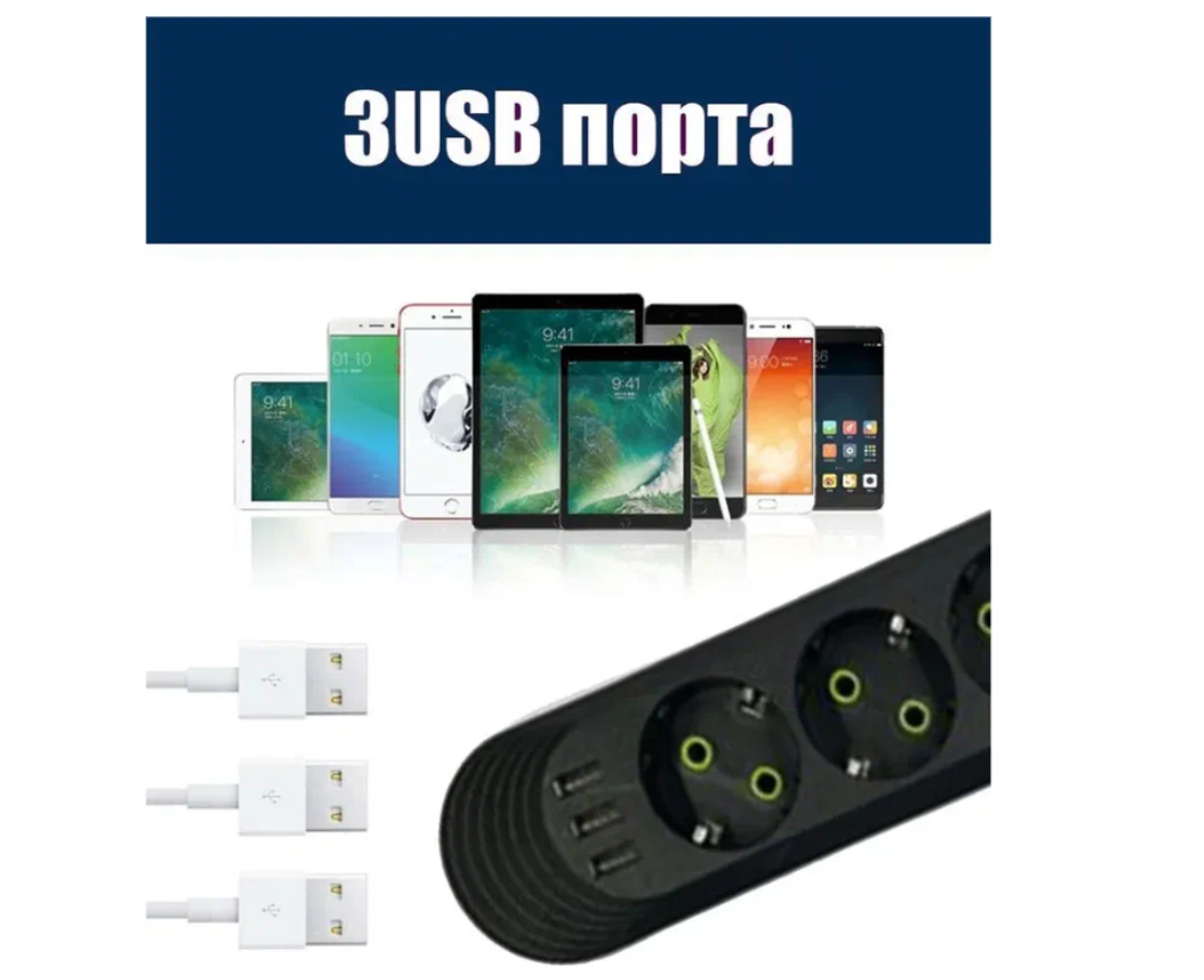 Удлинитель сетевой фильтр 3 метров 4 розетки + 3 USB черный EU интересное: