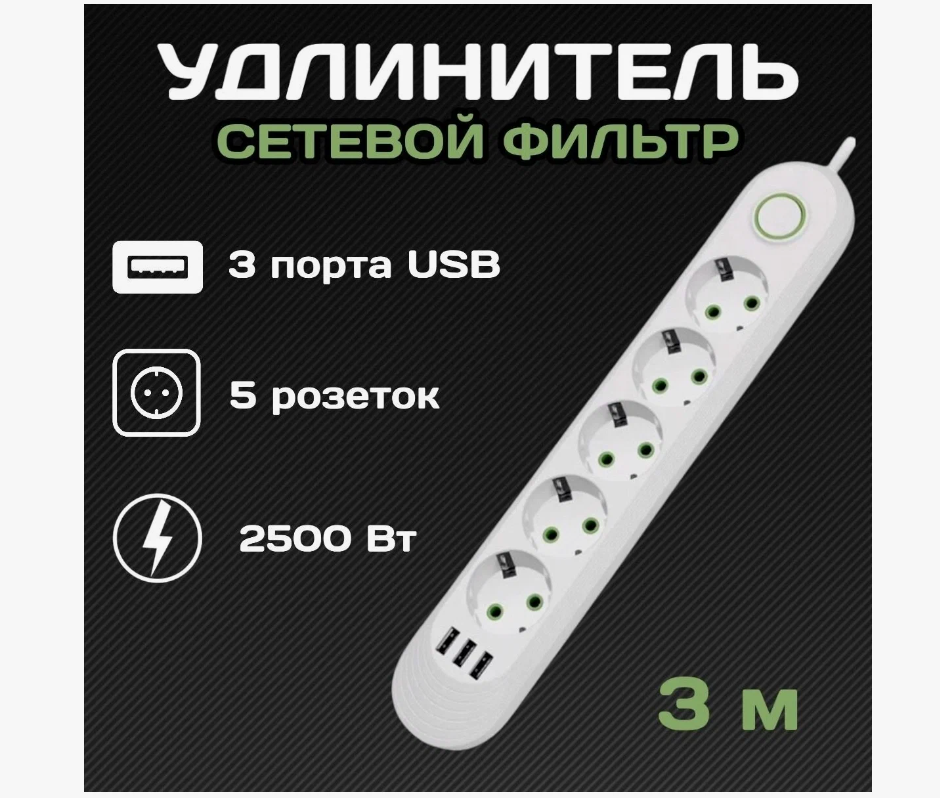 Сетевой фильтр с 5 розетками и 3 USB-портами, 3 метров, 10A, белый цвет. интересное: