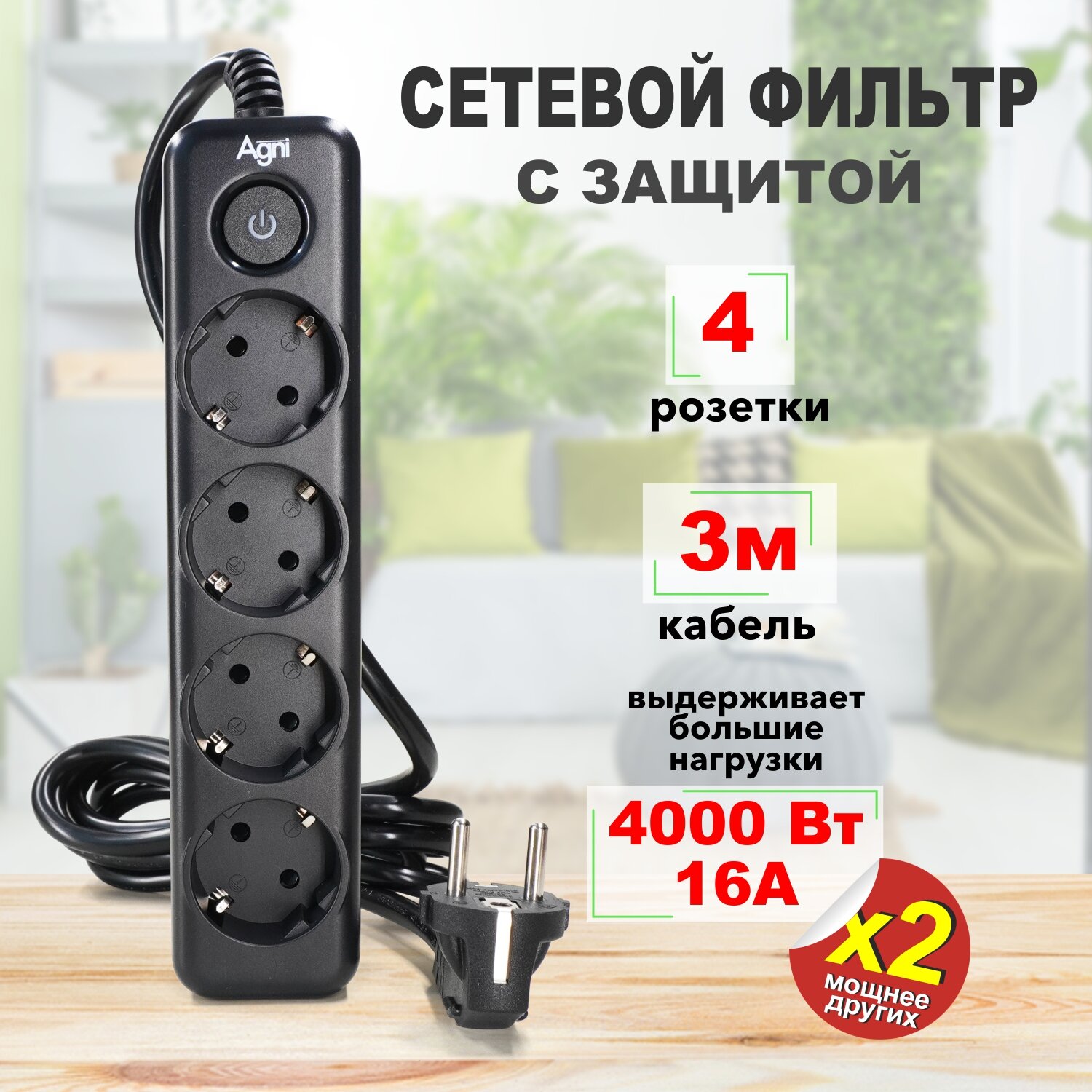 Сетевой фильтр с заземлением на 4 розетки AGNI с выключателем, защитные шторки, 4000 Вт/16 А, удлинитель 2 метра, черный