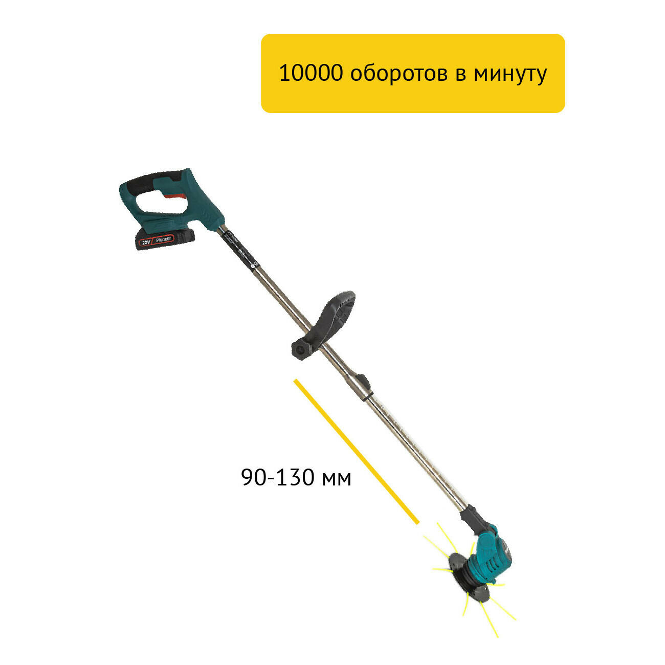 Триммер аккумуляторный Pioneer BGT-20V20-01 для травы с телескопической штангой и эргономичной рукояткой Anti-Slip, защита от случайного включения