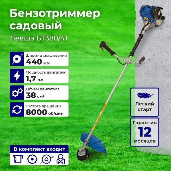 Купить Триммер бензокоса мотокоса Левша БТ380/4Т четырехтактная 38 куб см 1,7 лс 2,3 кВт леска 2,4мм нож 255мм