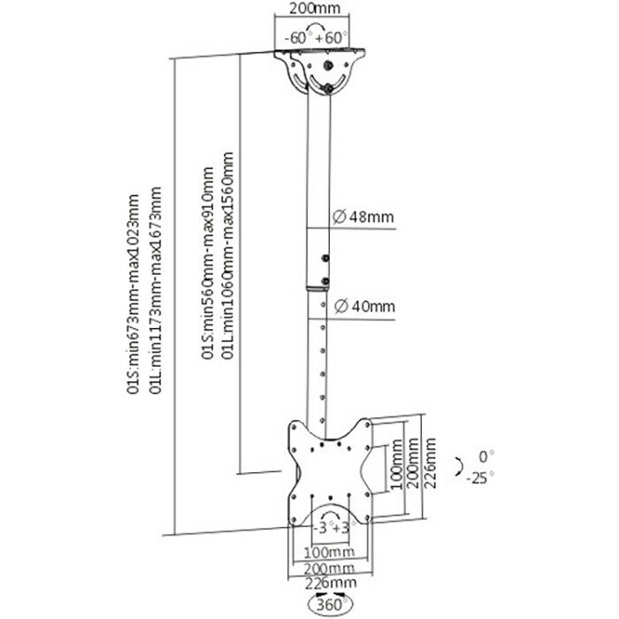 Кронштейн ARM Media LCD-1600 черный, профессиональный потолочный для LED/LCD/ TV 15"-48", max 55 кг, 3 ст свободы, VESA 200x200 мм