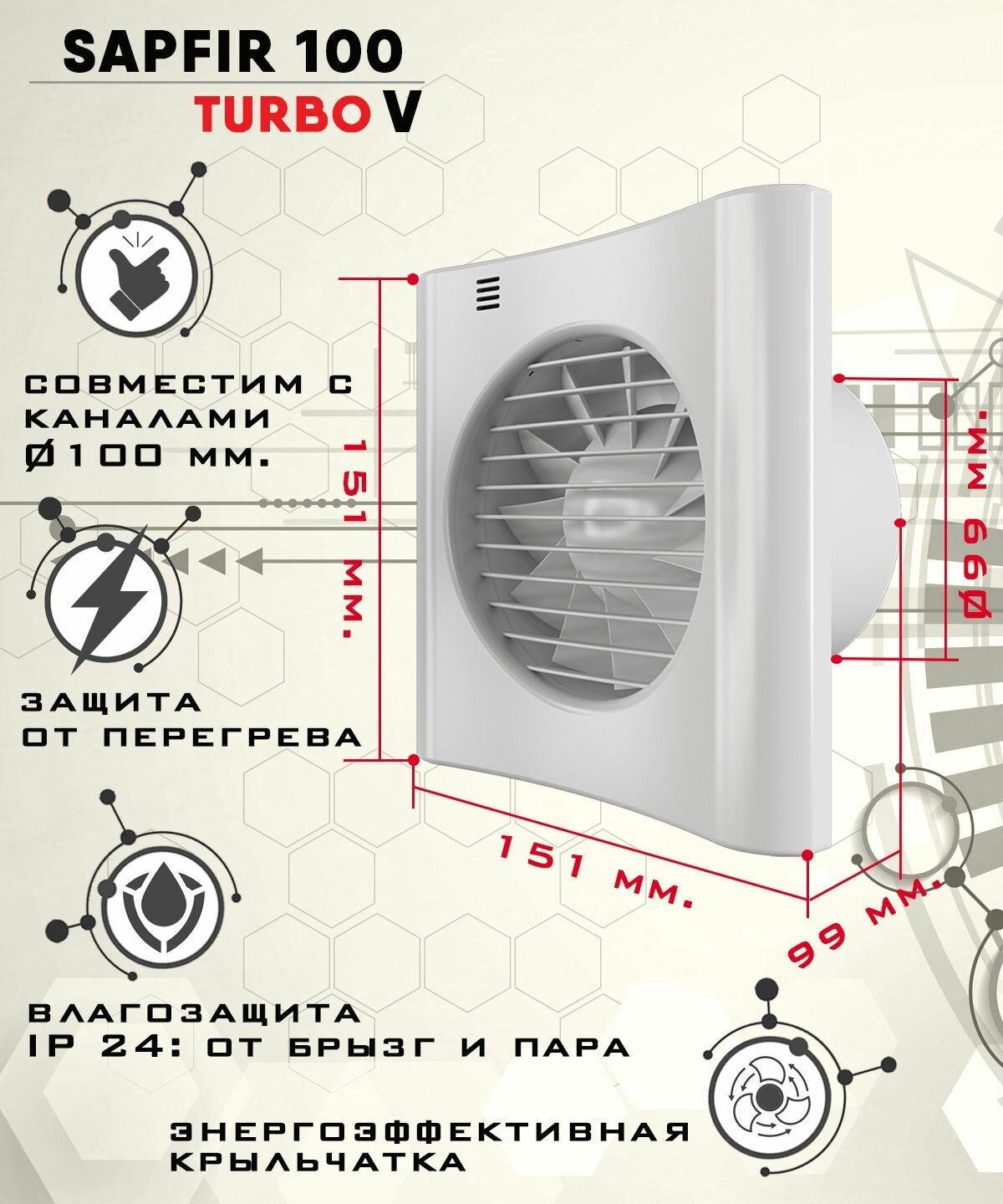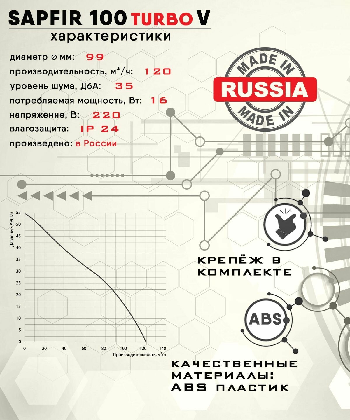 SAPFIR 100 TURBO V вентилятор вытяжной 16 Вт повышенной мощности 120 куб.м/ч. с обратным клапаном диаметр 100 мм ZERNBERG интересное: