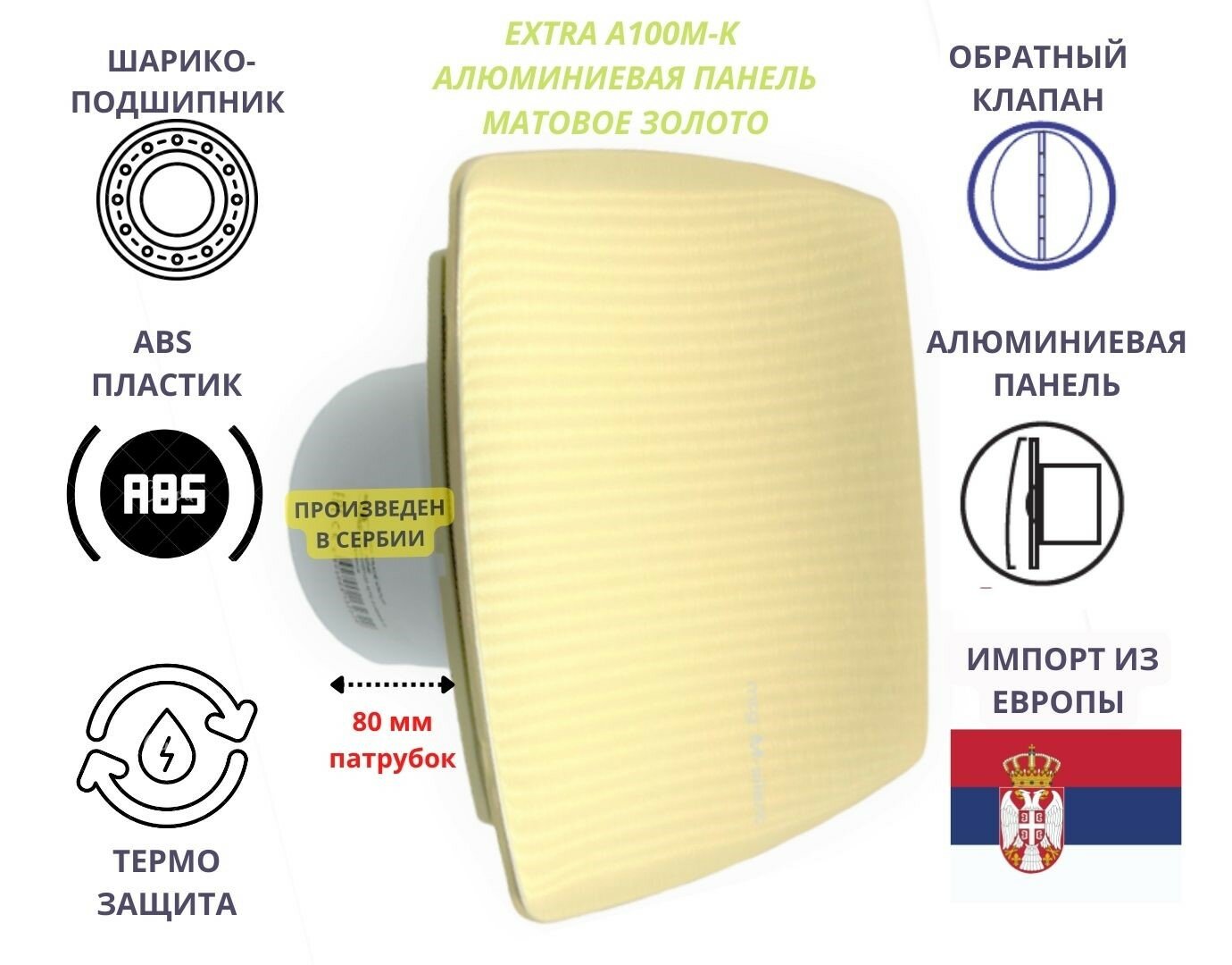 Вентилятор D100мм с алюминиевой золотистой матовой панелью и с обратным клапаном EXTRA A100М-K, Сербия интересное: