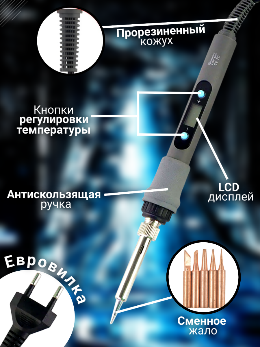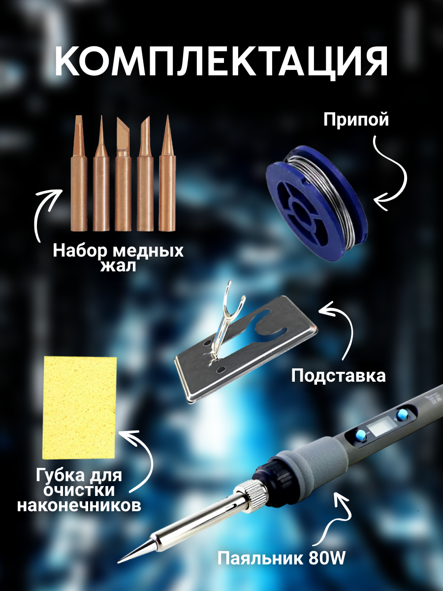 | Комплектация | Паяльник 80W, набор медных жал, припой с канифолью, подставка, губка для очистки жала |