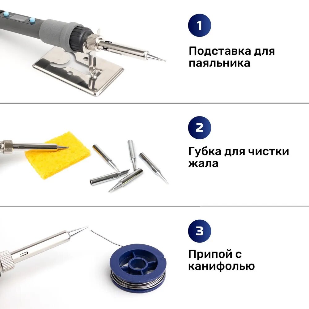 | Комплектация | Паяльник 80 Вт — 1 шт. Комплект дополнительных сменных жал типа 900М — 5 шт. Подставка для пайки — 1 шт. Губка для чистки паяльника — 1 шт. Припой для пайки — 1 шт. |
