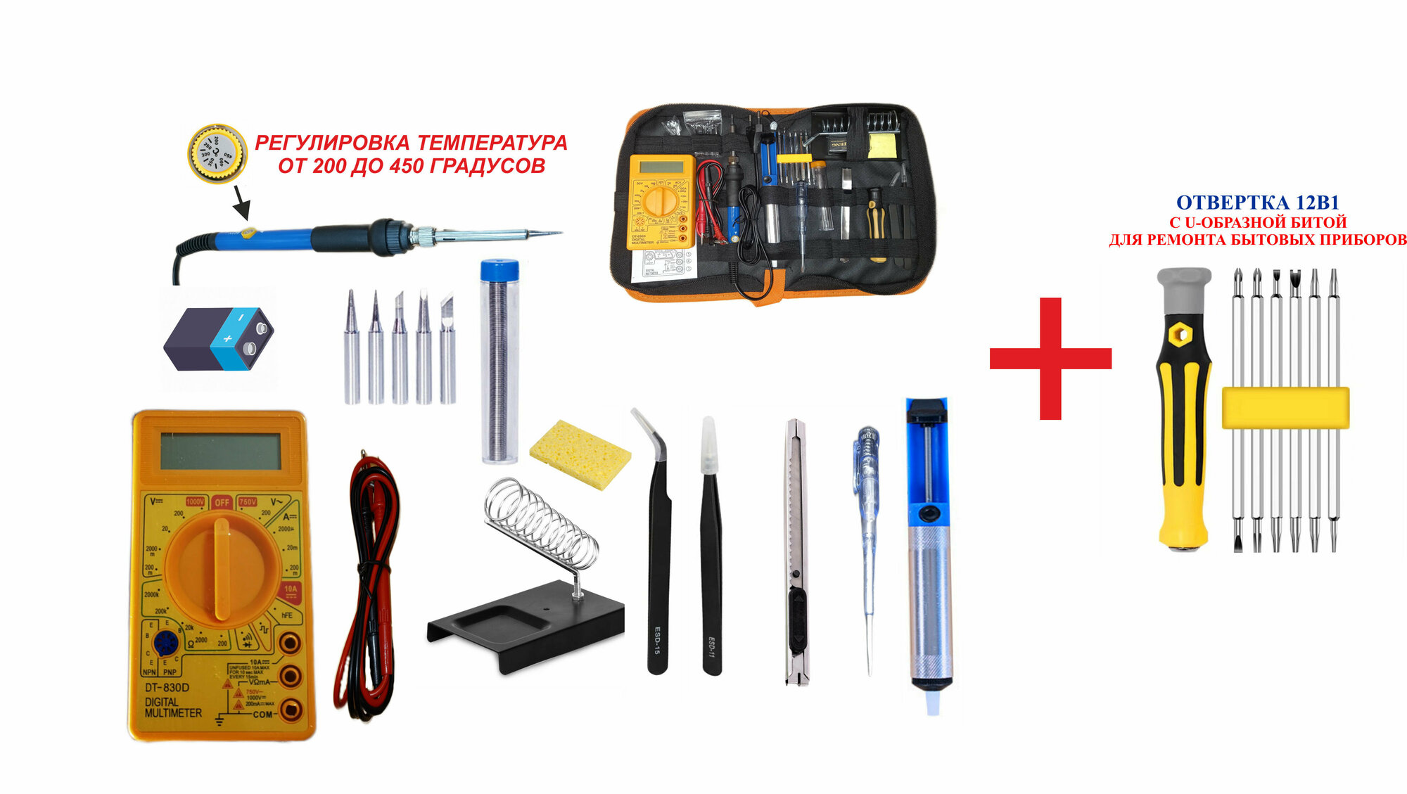 Купить Паяльник с регулировкой, набор для пайки №1-5, мультиметр 830, подставка, оловоотсос, припой, отвертка12в1
