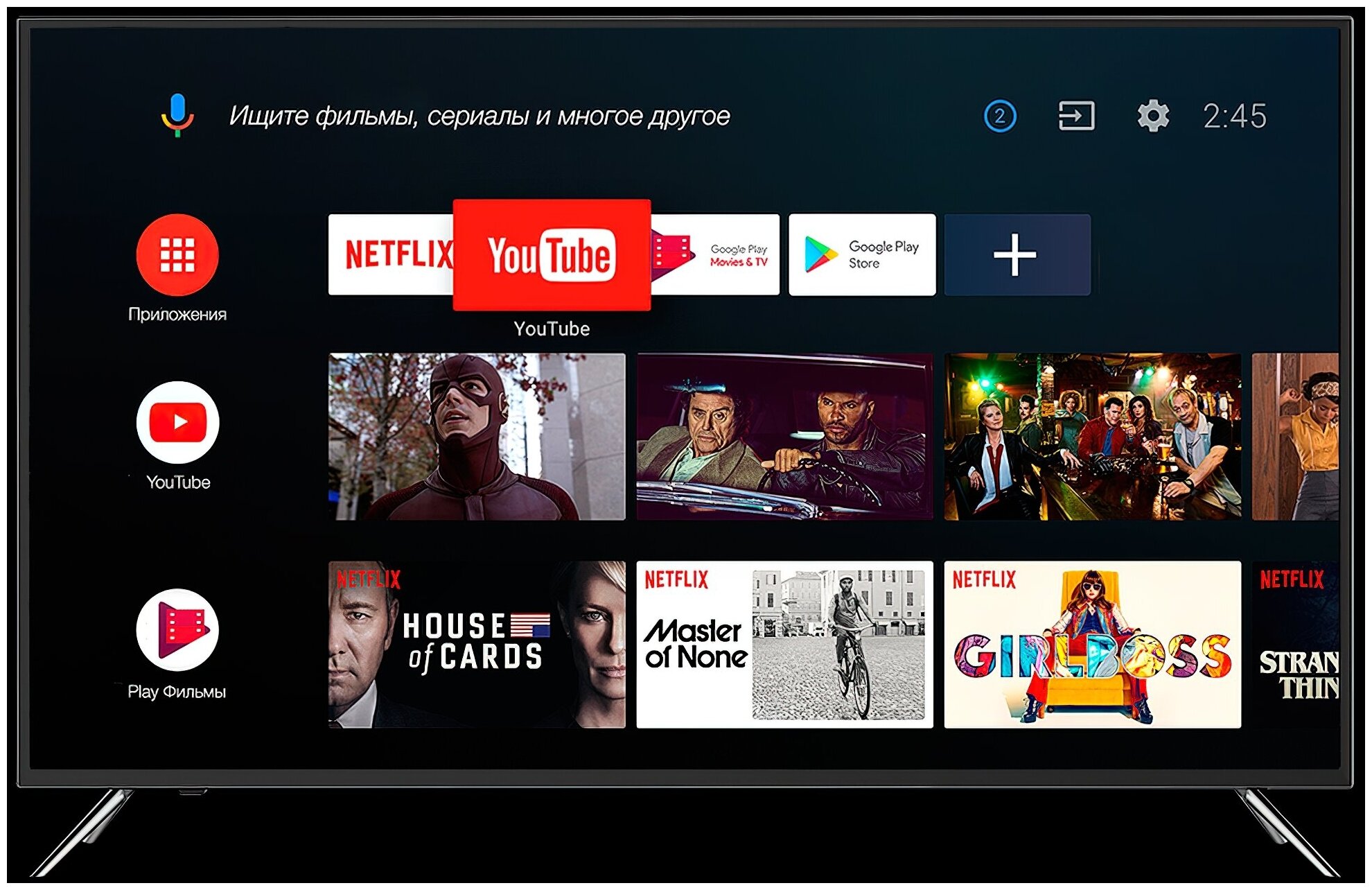 | Плюсы: | Чистый AndroidTV c возможностью модификации: если чуть-чуть доустановить пару-тройку приложений, можно получить очень мощный мультимедийный комбайн. |
