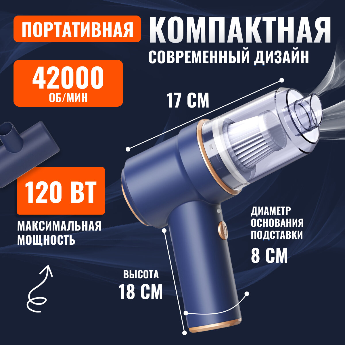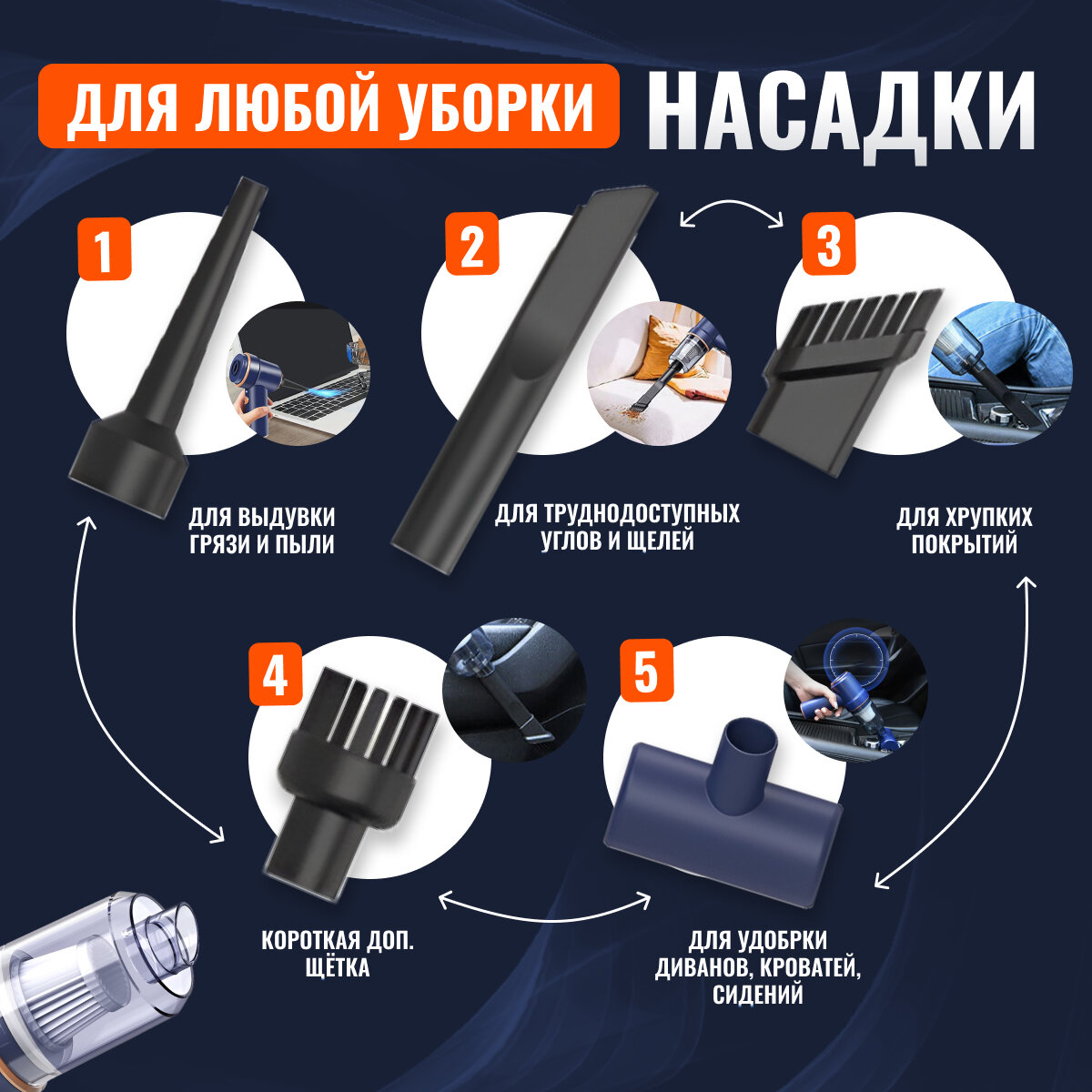 | Дополнительная информация | 1. Воздуходувка для компьютера, воздуходувка, пылесос для машины - 1 шт 2. usb-провод для зарядки - 1 шт. 3. Насадка для выдувки грязи и пыли - 1 шт. 4. Насадка для труднодоступных углов и щелей - 1 шт. 5. Насадка для хрупких покрытий - 1 шт. 6. Короткая дополнительная щетка - 1 шт. 7. Насадка для уборки диванов, кроватей/сидений - 1шт. |