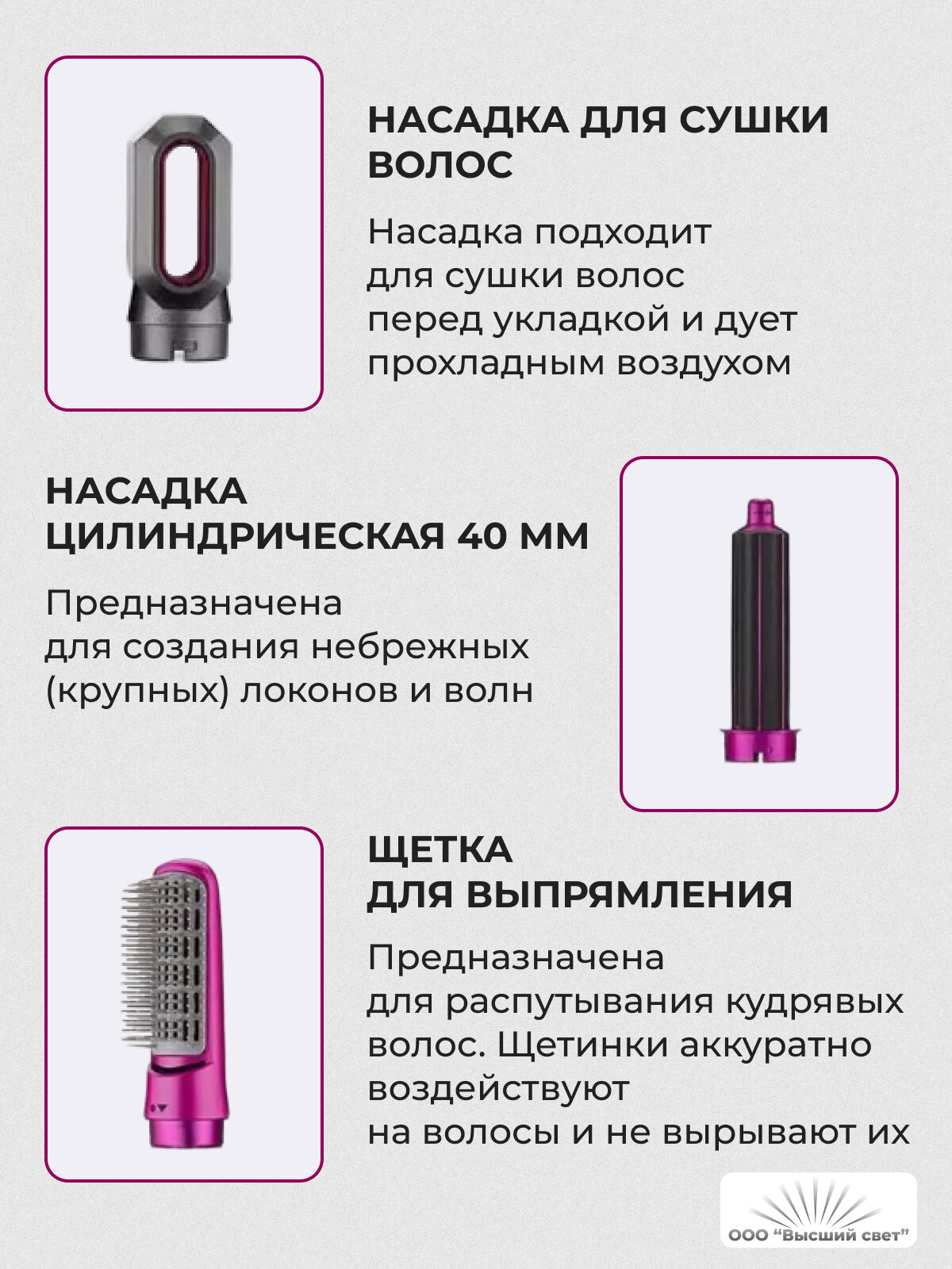 | Подробная комплектация | Мультистайлер для укладки волос 5 в 1 (4 насадки)-1шт; Насадка -концентратор -1шт; Насадка для придания объема от корней -1шт; Насадка-щетка для выравнивания -1шт; Насадка для создания локонов -2шт |