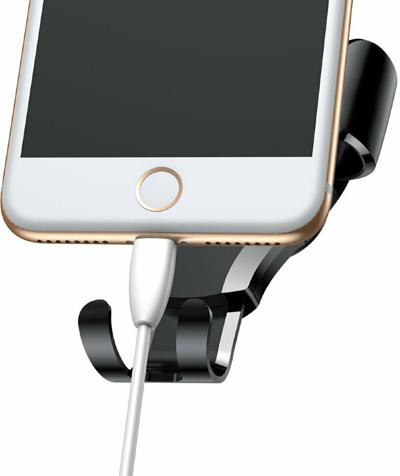 Интересная система удержания: боковые "лапки" сжимают телефон под действием веса телефона на нижнюю "полочку". Таким образом, регулировать ширину нет надобности. В самой "полочке" проем для провода зарядки. |