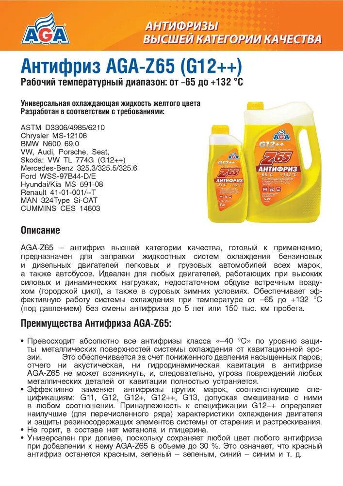 Антифриз, AGA, AGA043Z, желтый (-65/+132), 5 л. интересное: