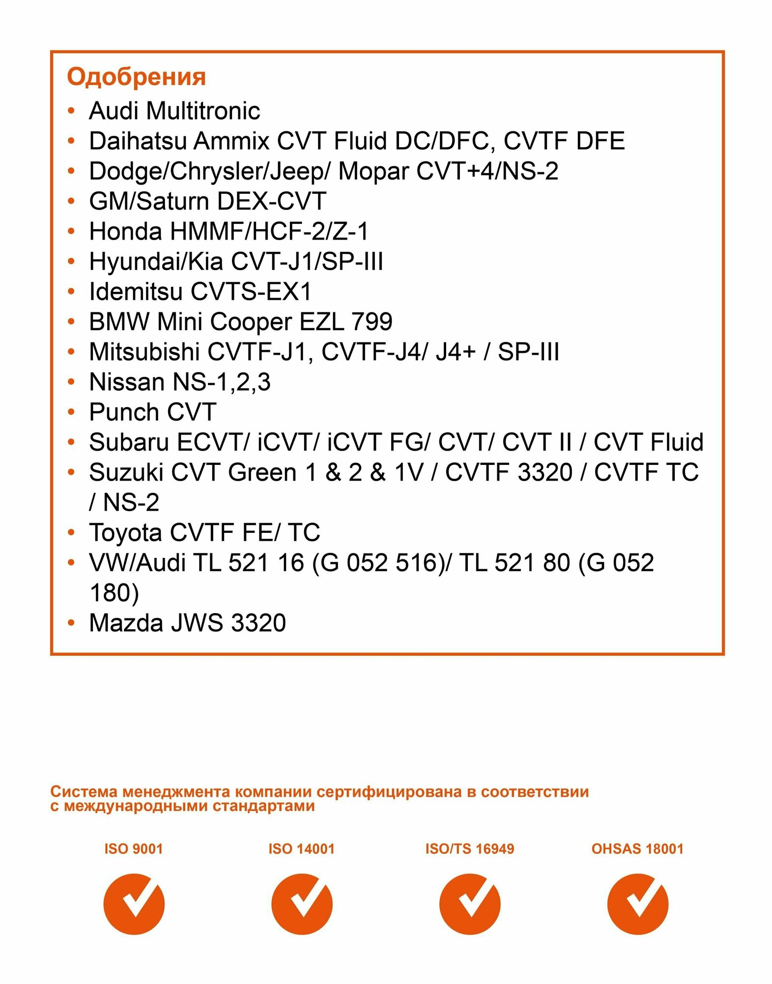 | Допуски OEM | GM DEX-CVT / Honda CVT HCF-2 / Jeep CVTF+4 / MB 236.20 / Mercon C / Mopar CVTF+4 / Subaru Lineartronic CVTF / Suzuki CVTF Green 1 / Suzuki CVTF Green 2 |