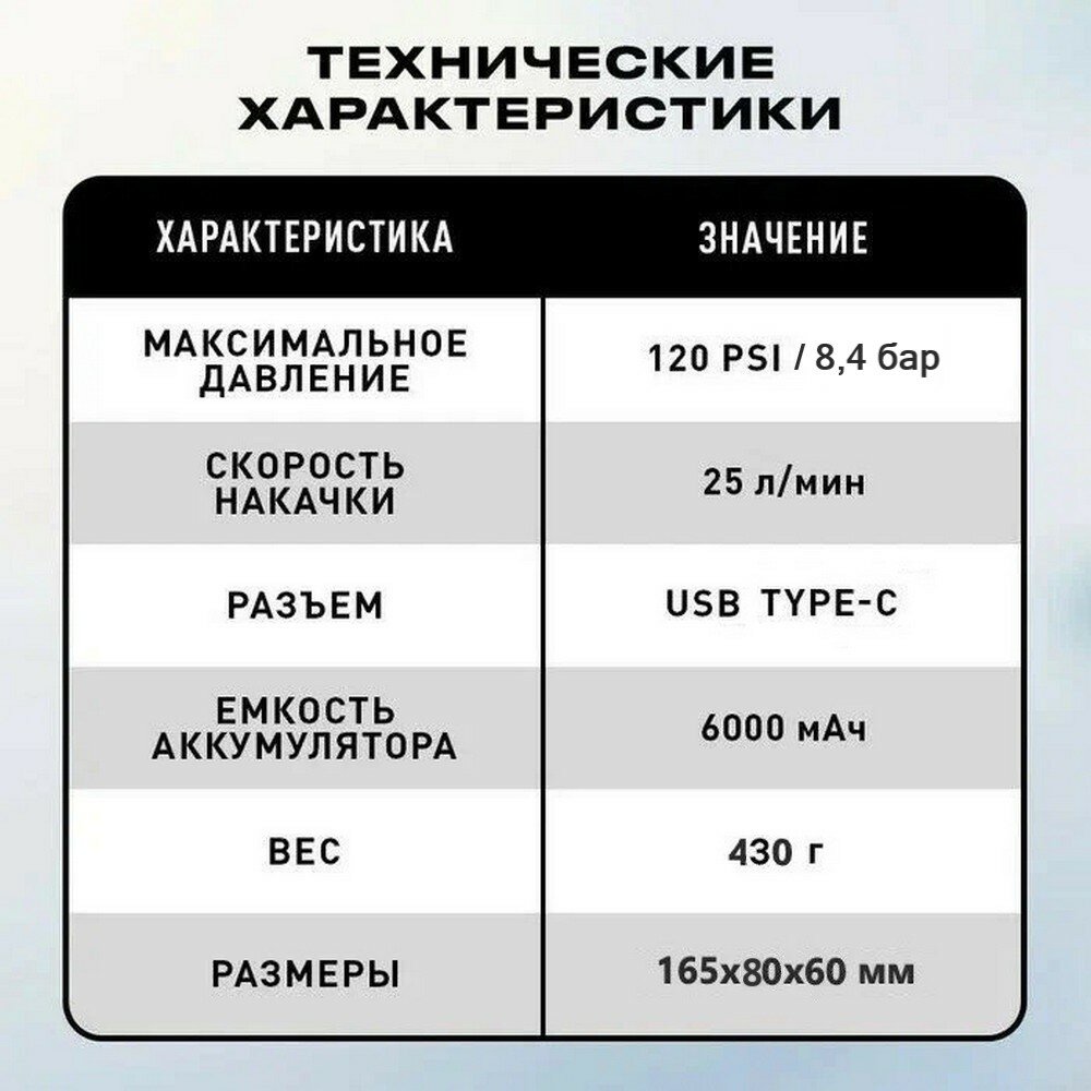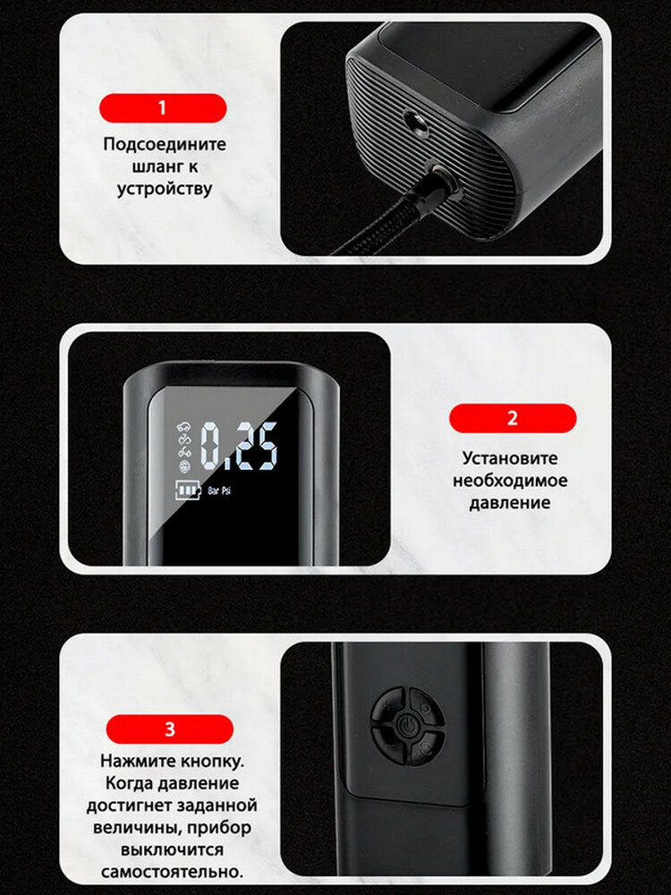 | Подробная комплектация | Компрессор - 1 шт., шланг резьбовой - 1 шт., насадки - 3 шт., кабель для зарядки USB Type C - 1 шт., инструкция (на русском языке, на английском языке) - 2 шт. |