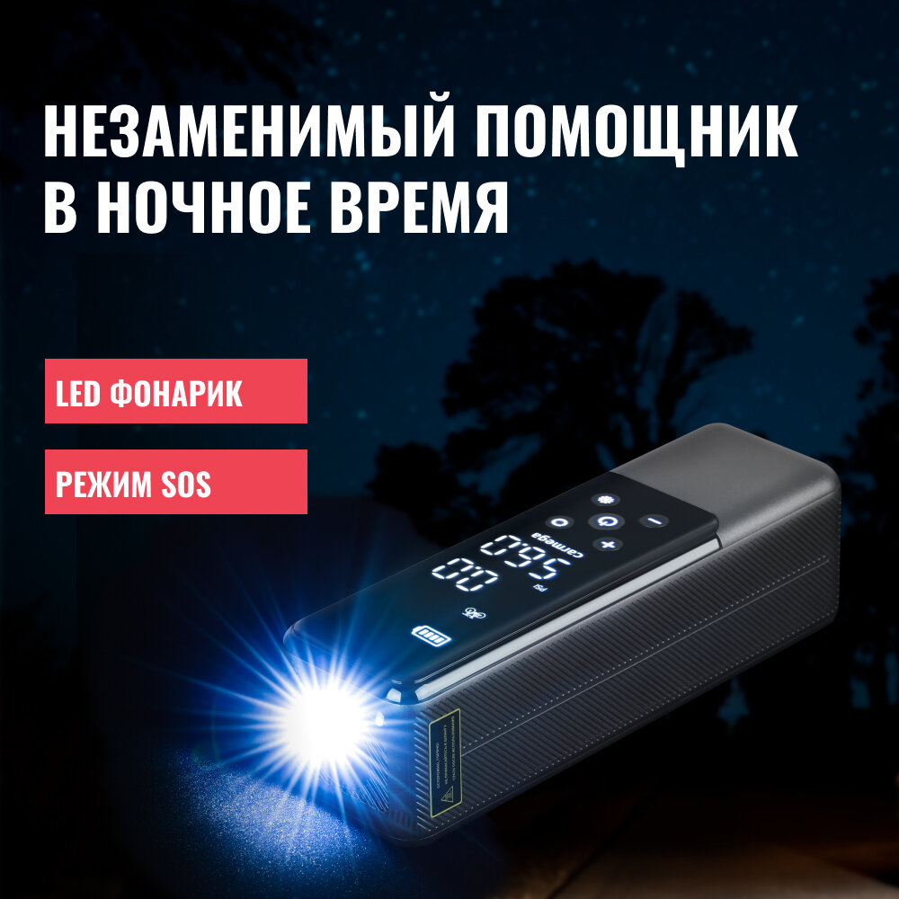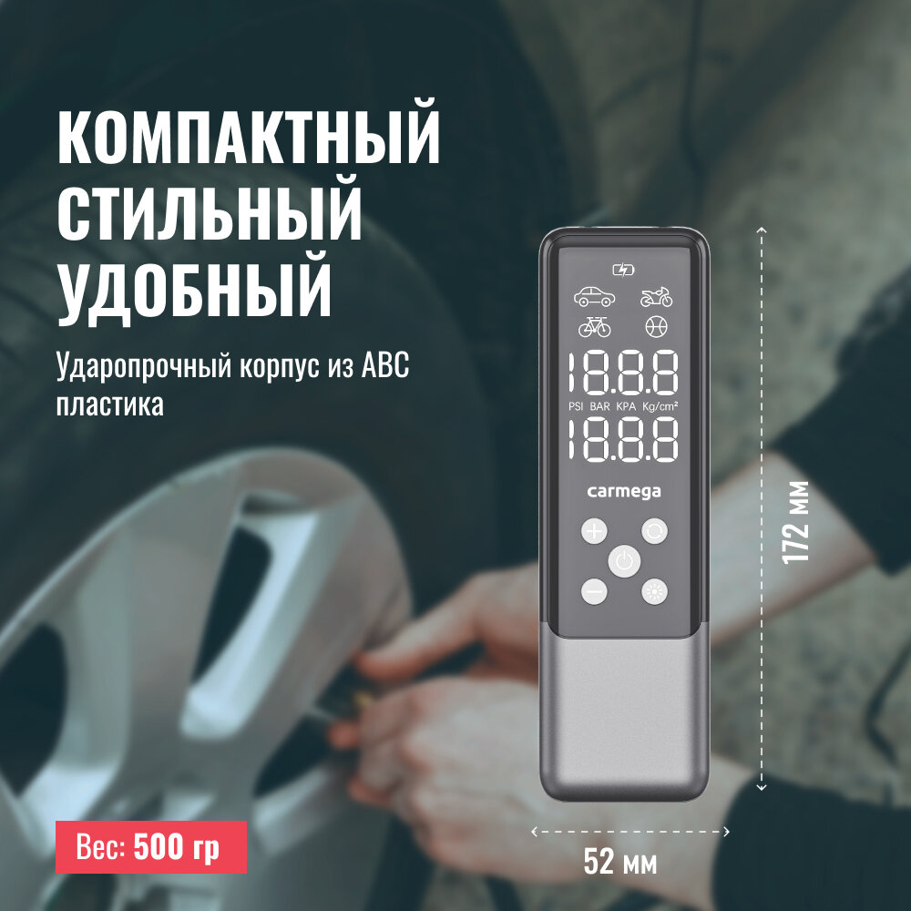 CARMEGA CD07 Компрессор автомобиьный портативный 10атм. 5000мАч фонарь, 3 насадки, чехо CARMEGA