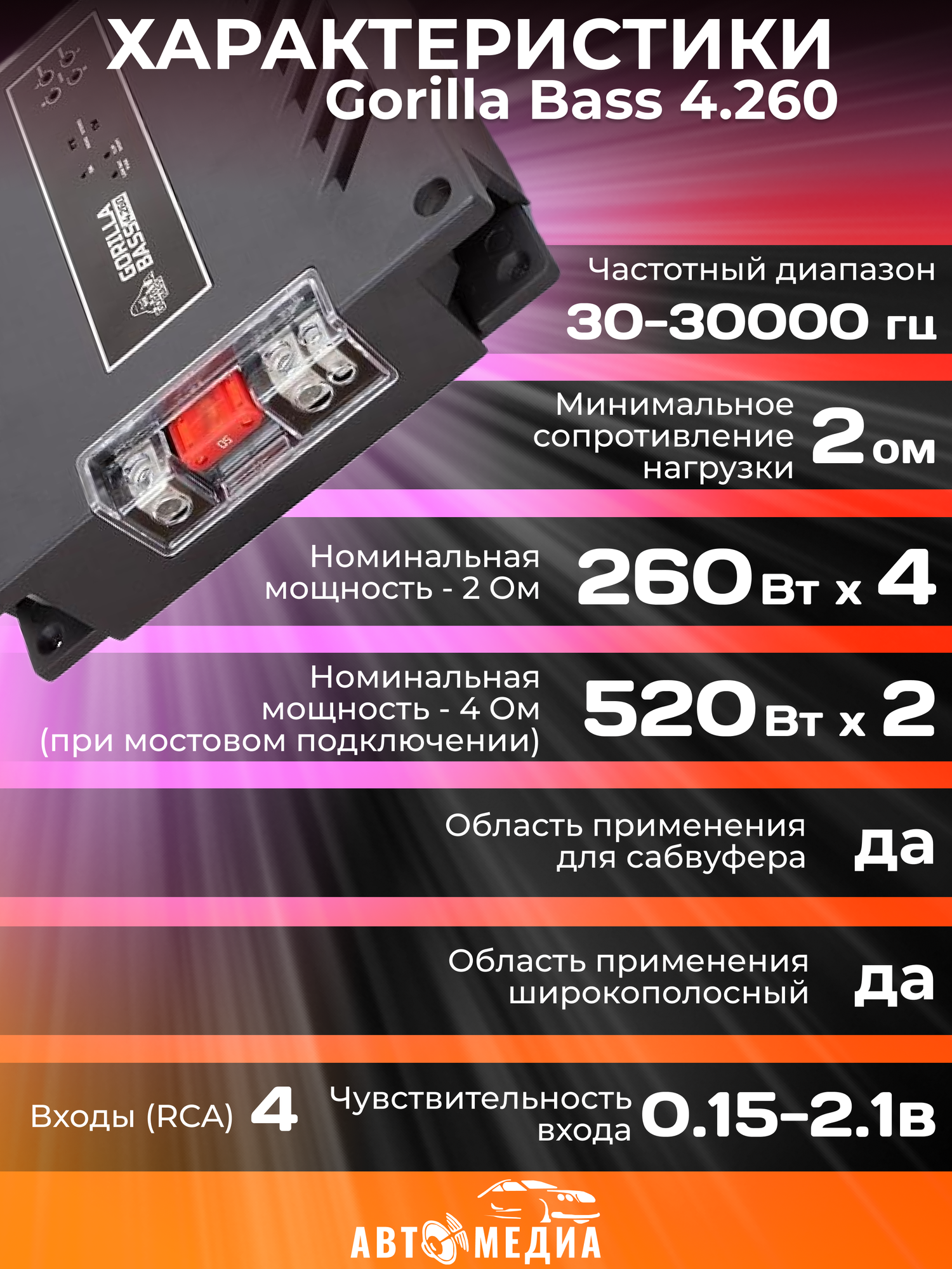 Усилитель автомобильный Gorilla Bass 4.260 интересное:
