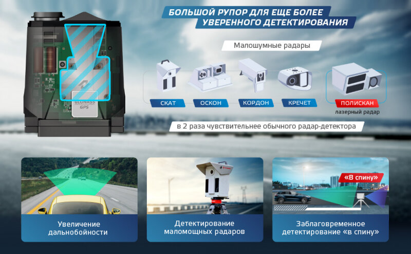 | Обнаружение радаров | "K-диапазон", "Lazer", "Mesta", "X-диапазон", "Автоураган", "Арена", "Беркут", "Бинар", "Визир", "Вокорд", "Интегра-КДД", "Искра", "Кречет", "Крис", "ЛИСД", "Одиссей", "Оскон", "Поток-С", "Рапира", "Скат", "Сокол", «Robot», «Автодория», «Кордон», «Стрелка» |