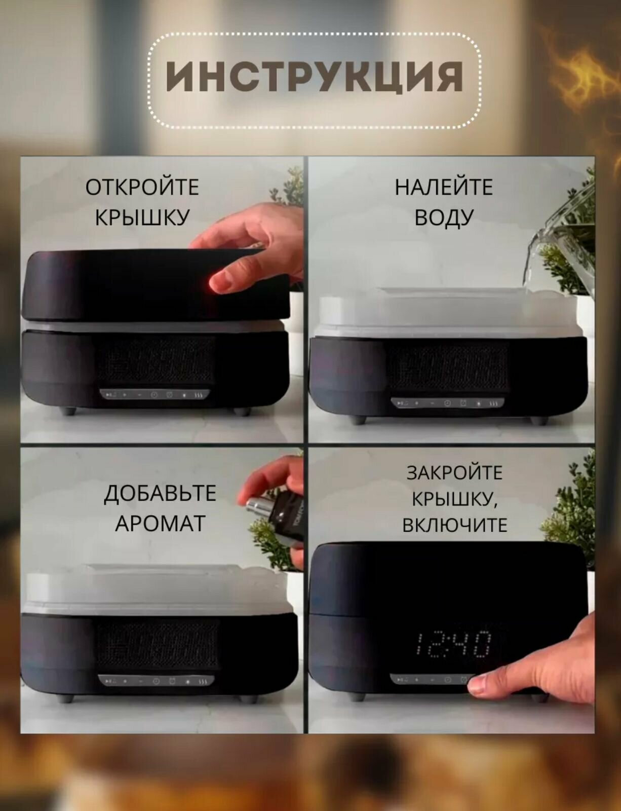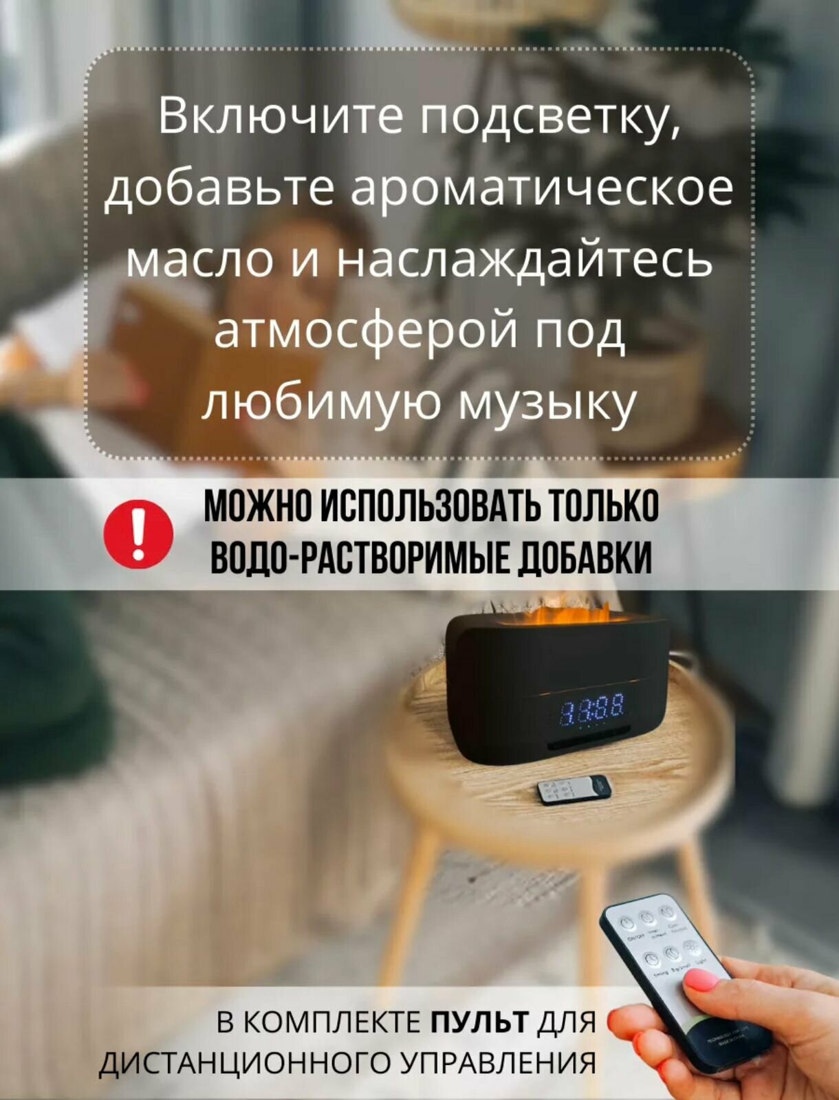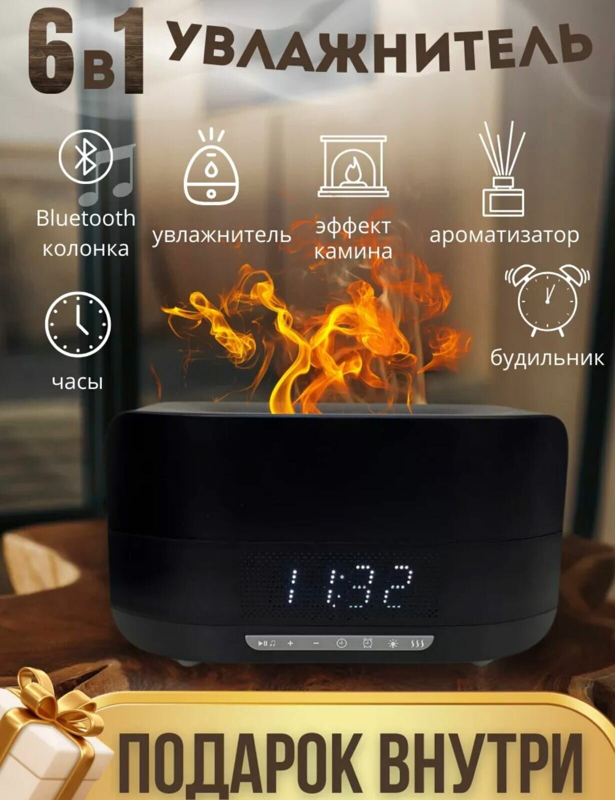 Увлажнитель воздуха с эффектом пламени с функцией ароматизации, часы и встроенная блютуз колонка/Аромадиффузор для эфирных масел интересное: