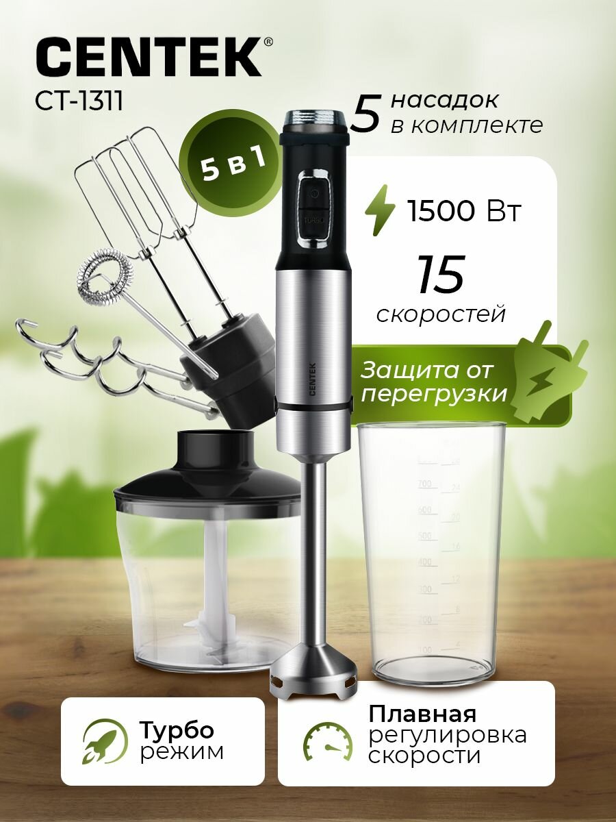 Блендер погружной CENTEK CT-1311, 1500 Вт, 15 скоростей, 5 насадок, стакан, черный, 457568