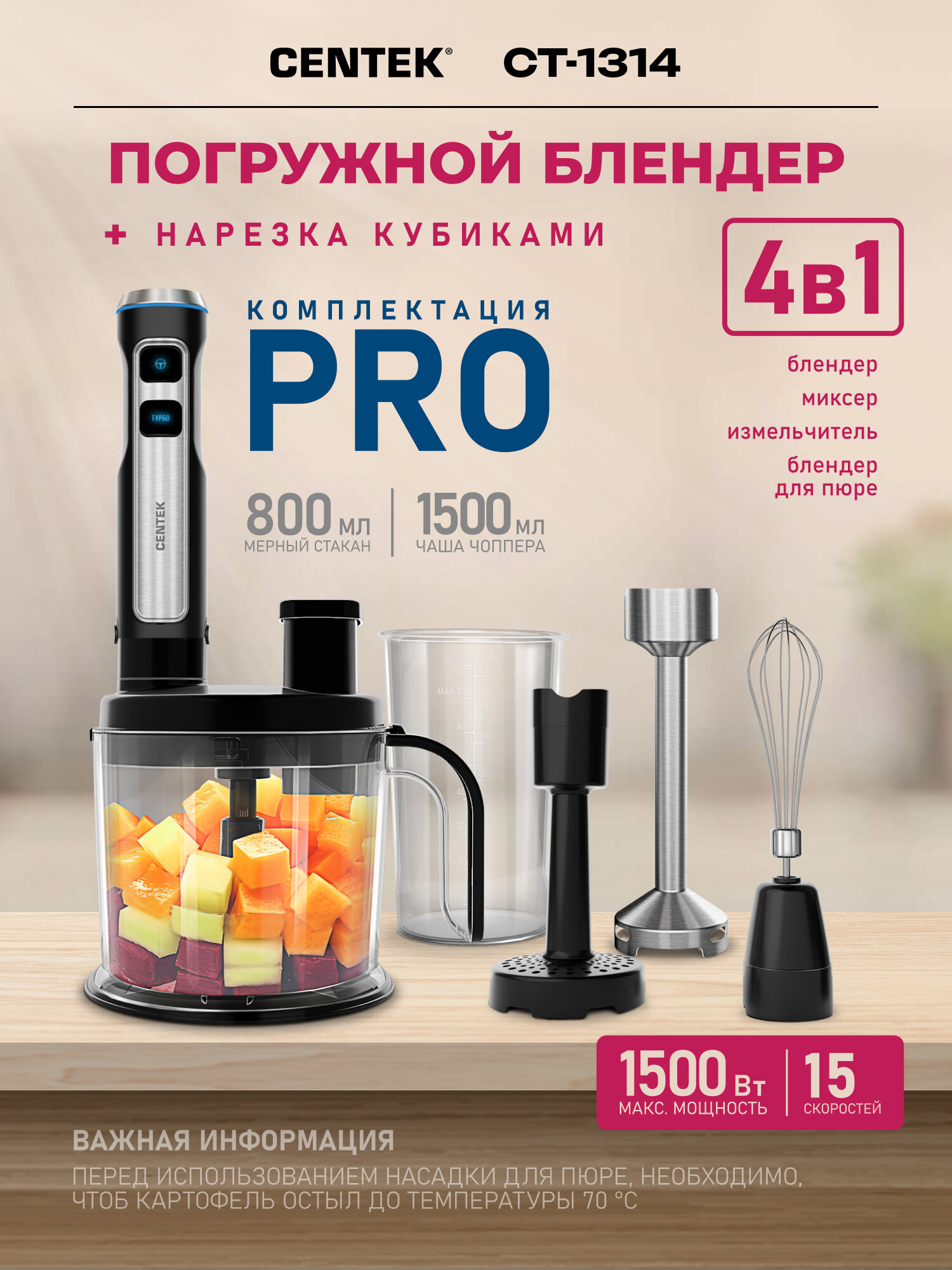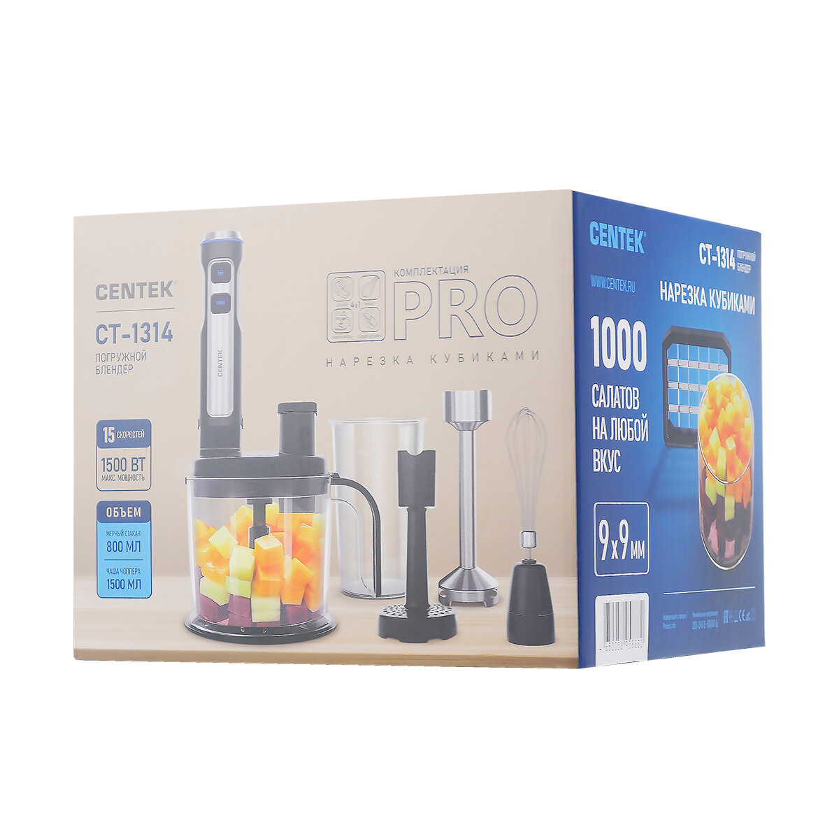 Блендер погружной Centek CT-1314 1500Вт, шинковка 1.5л (нарезка кубиков 9х9мм), чоппер 1.5 л, венчик, 800 мл. стакан интересное: