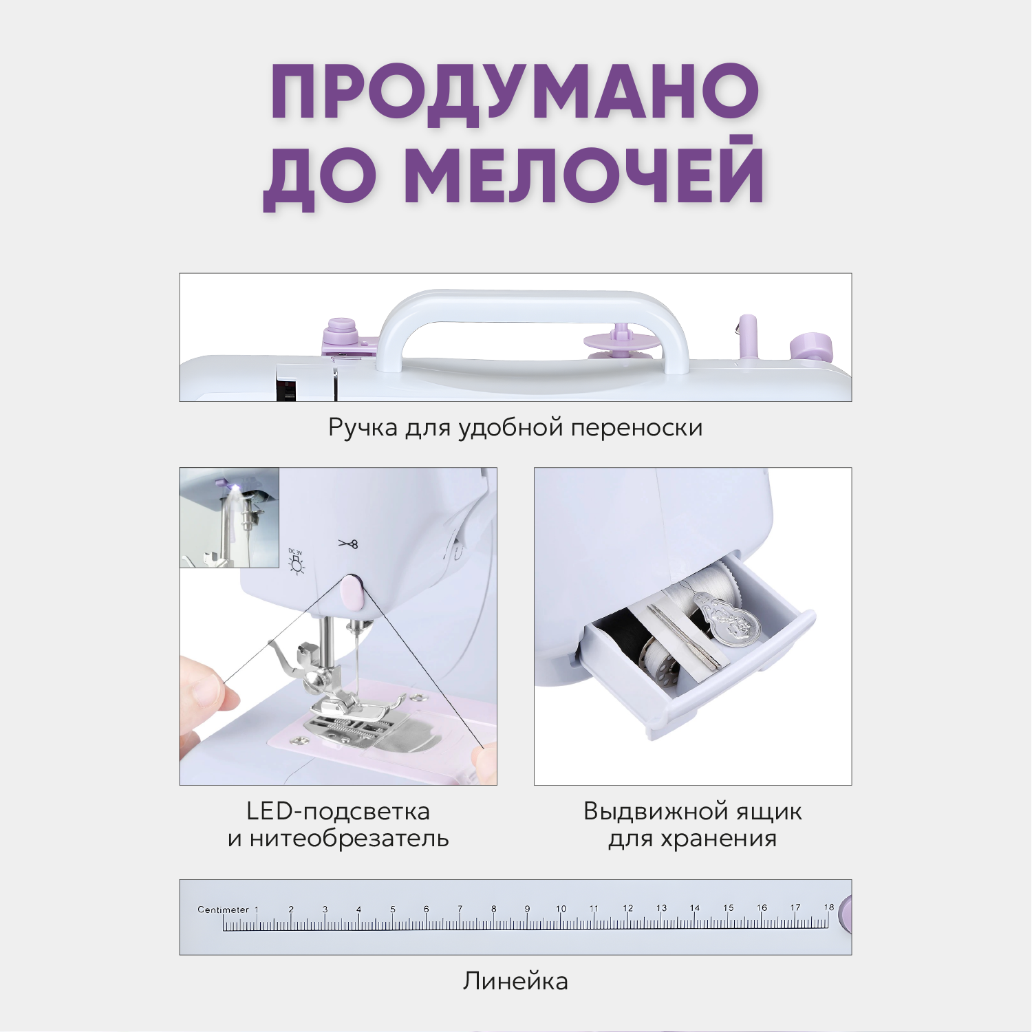| Особенности конструкции | линейка на корпусе, нитевдеватель, отсек для аксессуаров, подсветка |