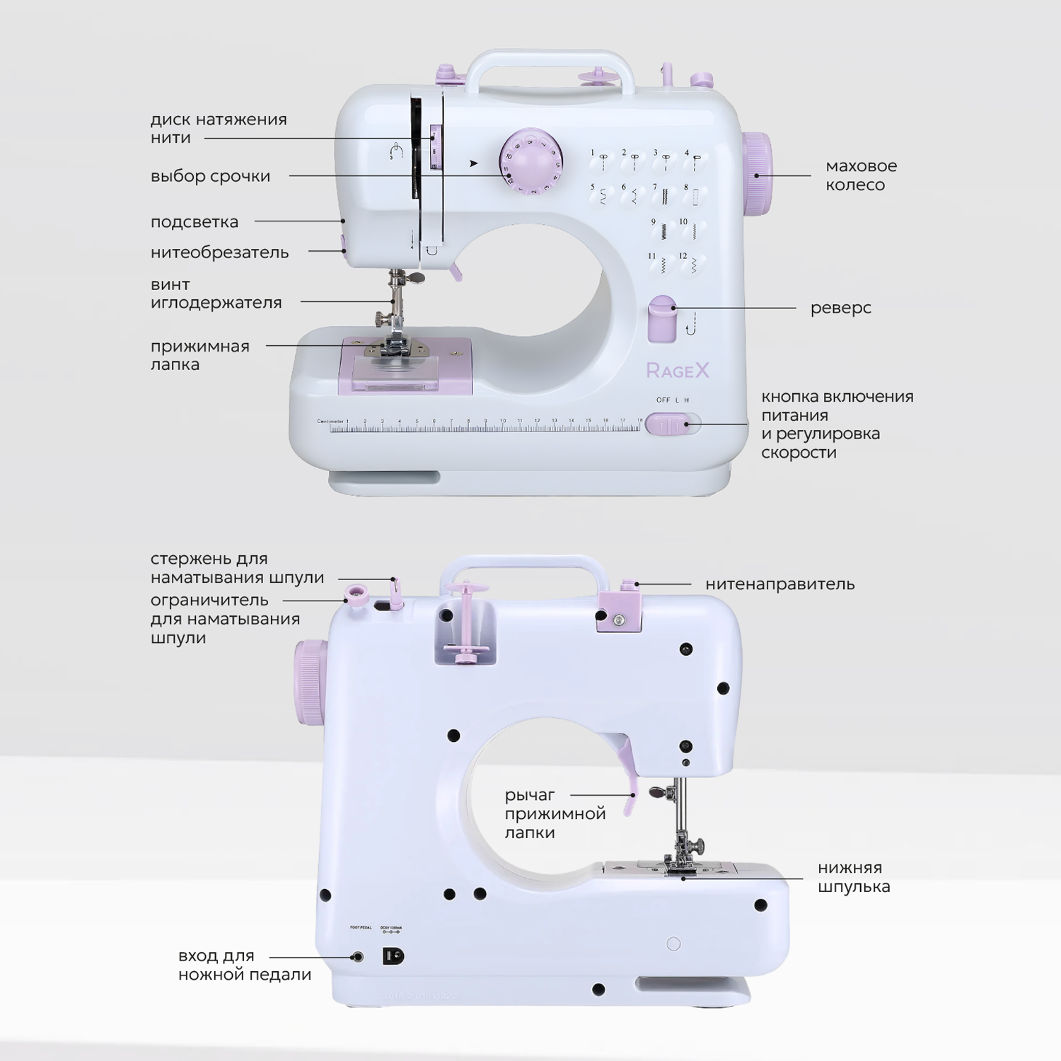 Мини швейная машинка Rage XR1101-100, электрическая 12 типов стежков, 2 скорости + педаль, работает от сети и батареек интересное:
